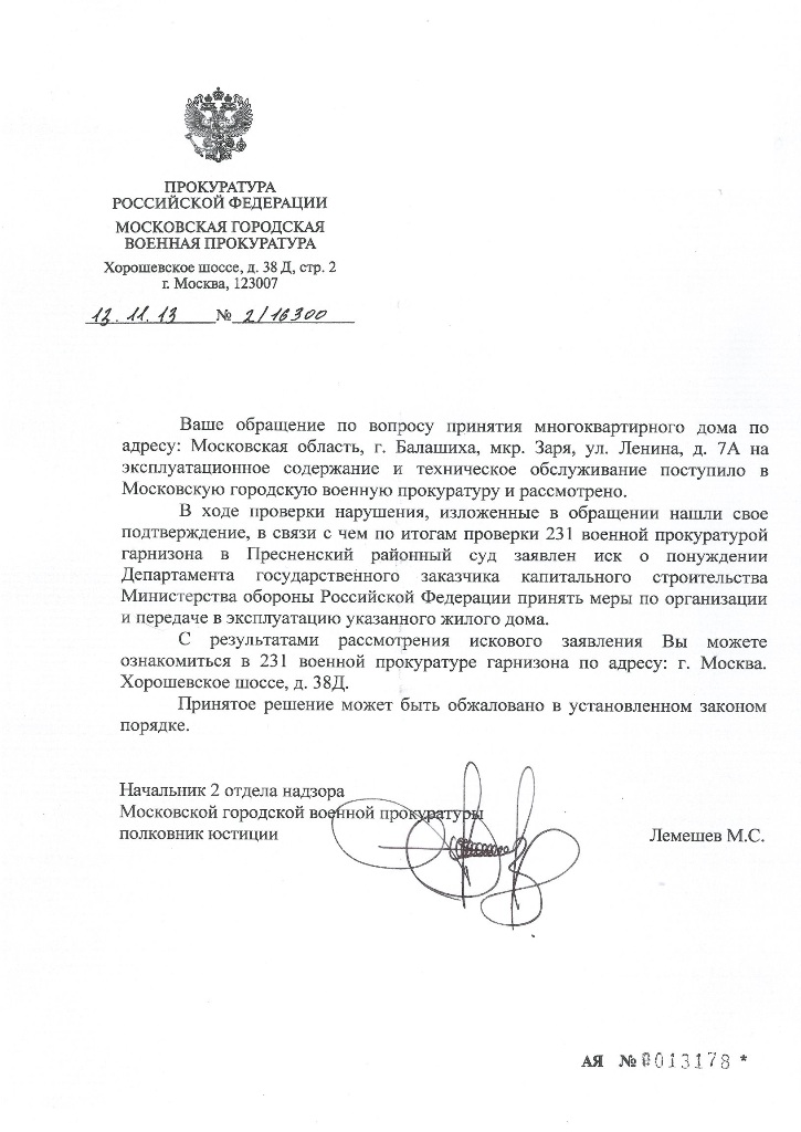 «В ходе проверки нарушения, изложенные в обращении нашли свое подтверждение, в связи с чем по итогам проверки 231 военной прокуратурой гарнизона в Пресненский районный суд заявлен иск о понуждении Департамента государственного заказчика капитального строительства Министерства обороны Российской Федерации принять меры по организации и передаче в эксплуатацию указанного жилого дома» Если кто-то еще направлял обращения в МГВП, то входящий номер можно узнать по телефону канцелярии 8 (495) 693-56-07.