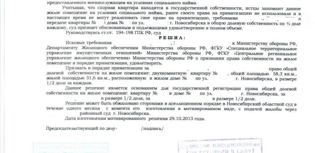 На основании вышеизложенного, в соответствии с требованиями Закона РФ «О приватизации жилищного фонда в Российской Федерации» от 04.07.1991 г. № 1541-1 просим суд признать право собственности в порядке приватизации на жилое помещение – квартиру № .. расположенную по адресу г. Новосибирск, ул. .... за ... (я +1)