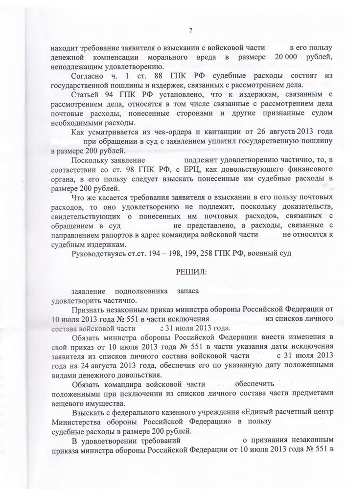 2. Обязать Министра обороны РФ отменить приказ Министра обороны РФ от 10 июля 2013г. № 551 раздел ХХХХХ в части касающейся исключения меня с 31 июля 2013 года из списков личного состава войсковой части ХХХХХ.