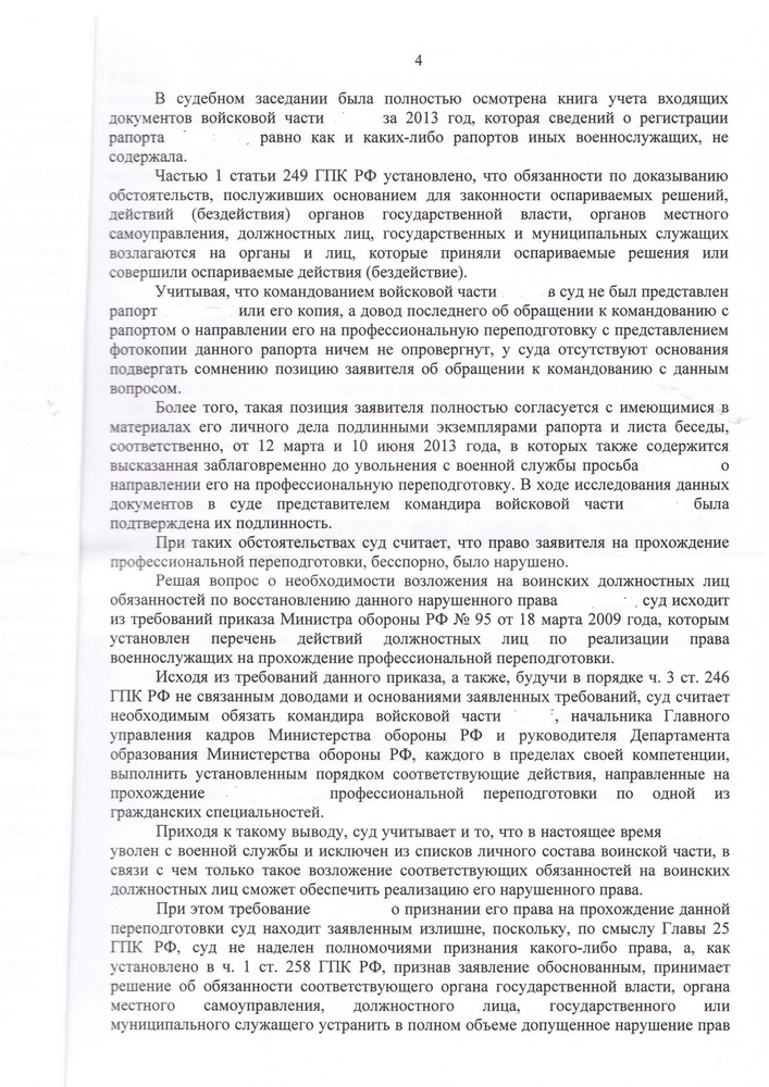 Таким образом, мною неоднократно предпринимались попытки добиться от командования войсковой части ХХХХХ реализовать мое право на профессиональную переподготовку по одной из гражданских специальностей в соответствии с приказом Министра обороны РФ 2009 года № 95. Все беседы проходили в присутствии сторонних и незаинтересованных свидетелей. О моем желании пройти переподготовку и попытках решения данного вопроса с командованием войсковой части ХХХХХ могут свидетельствовать ХХХХХ и другие военнослужащие.