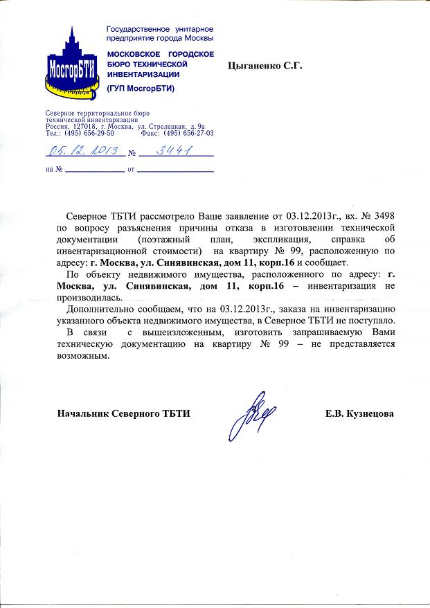 Сегодня получил ответ из Северного ТБТИ г. Москвы по поводу отсутствия информации по нашим домам. Пишут, что инвентаризация наших домов не производилась и заявок на ее проведение не было и нет. Напрашивается вопрос кто должен делать заявку на проведение инвентаризации, что бы в БТИ появилась соответствующая информация, которая нужна нам для приватизации через суд. У меня уже суд отложили из за отсутствия доказательств из БТИ.