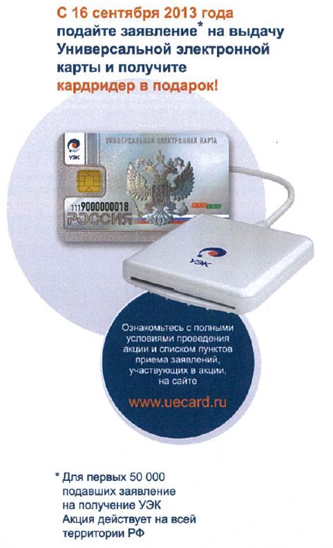 При подаче заявления об оформлении универсальной электронной карты (УЭК) в офисе Сбербанка в качестве подарка вручили картридер - считыватель для УЭК. Пояснили, что проводится какая-то акция.
