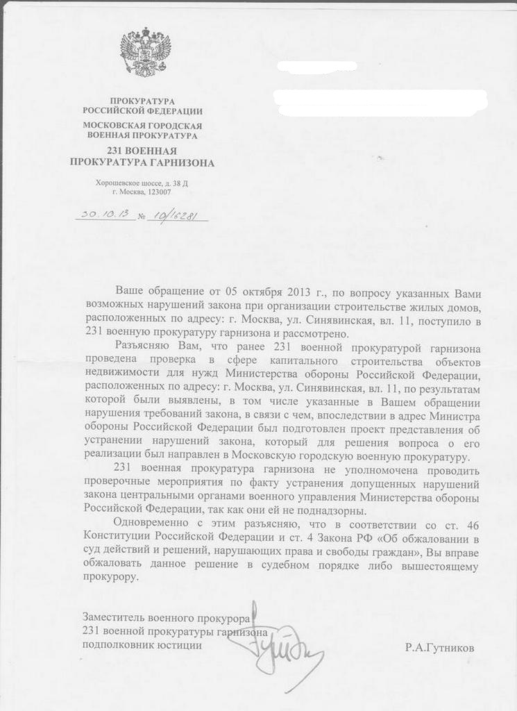02.08.2013 года заместителем военного прокурора 231 военной прокуратуры гарнизона полковником юстиции Гутниковым Р.А. мне был дан ответ, что по результатам ранее проведенной проверки в деятельности должностных лиц Минобороны России при осуществлении жилой застройки по адресу: г. Москва, ул. Синявская, вл.11, выявлены нарушения требований градостроительного законодательства, об устранении которых 231 военной прокуратурой гарнизона в адрес заместителя Минобороны России подготовлен проект представления, который направлен для реализации в Московскую городскую военную прокуратуру.