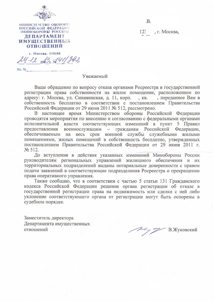 это решение одного из судей первой инстанции насколько я помню. ну это его мнение.На странице 314 (сообщение 9409) этой ветки видел письмо об отказе в регистрации. Там четко сказано, что постановление 512 требует предоставлять ж.п. в собственность только военнослужащим (п. 1 постановления).