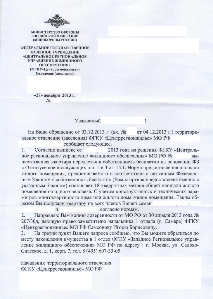 от 00.00.2013 года ФГКУ «Центральное региональное управление жилищного обеспечения» МО РФ № 000000 без указания долевой собственности, 2 экземпляра акта приема передачи жилого помещения с указанием в принимающей стороне только меня. Данные документы прошу оформить в соответствии с Постановлением Правительства РФ 29 июня 2011 года № 512 и Приказом МО РФ от 13 октября 2011 года № 1850.