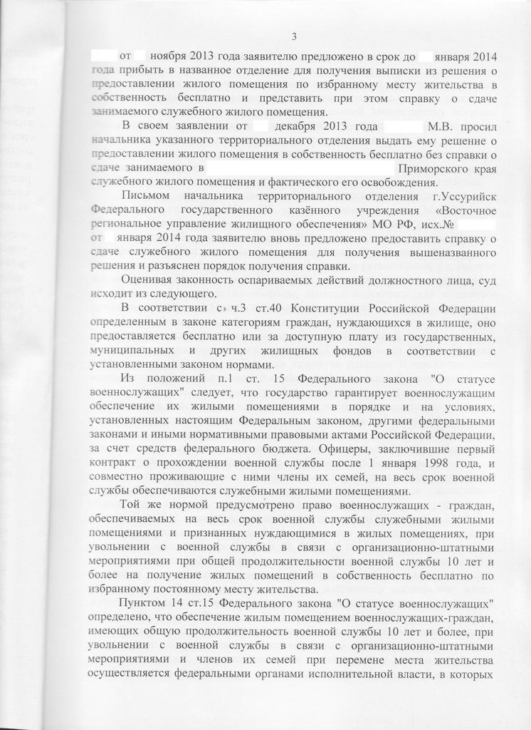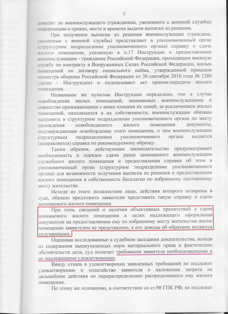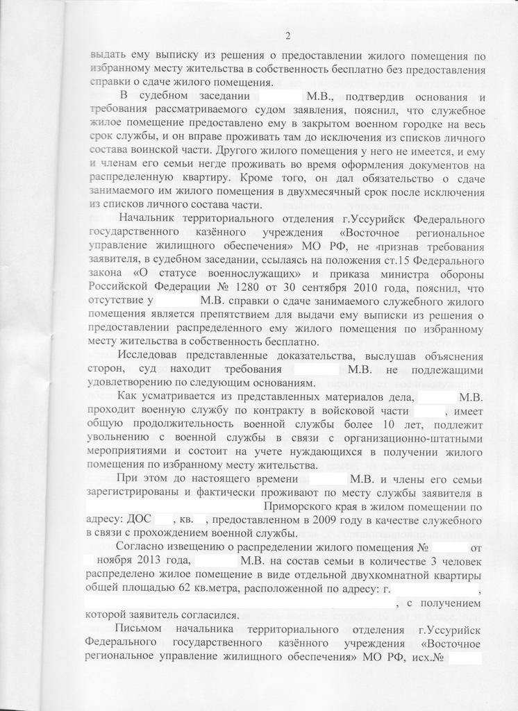 Была направлена апелляция в суд ТОФ. Итог: решение гарнизонного суда оставить без изменени...Всем доброго времени суток! Ситуация следующая. Нахожусь в распоряжении командира части с 2009 года, ОШМ. В ноябре пришло извещение на квартиру, согласился. Соответственно через некоторое время пришло письмо из тер. отдела о необходимости прибыть за выпиской из решения. Так же в в письме было указано какие документы предоставить, среди них пресловутая справка о сдаче служебки. Соответственно после этого я обратился с заявлением к нач. тер. отделения ВРУЖО с просьбой выдать решение без предоставления справки. Мне было отказано. После этого я обратился в суд с заявлением об оспаривании действия нач. тер. отд. ВРУЖО в части требования от меня справки о сдаче. Суд встал на сторону ВРУЖО и отказал мне в моих требованиях. Может я что то не так сделал??? Подскажите куда и что дальше делать?Решение выкладываю.