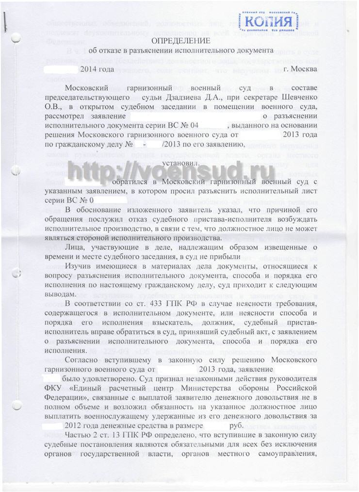 оставлю без комментариевЯ просто удивляюсь, каким образом определение о разъяснении (само по себе очевидно очень хорошо и понятно написанное) может помочь преодолеть несоответствие исполнительного документа требованиям ст. 13 ФЗ"Об исппроизв", что в свою очередь позволяет отказать в возбуждении исппроизводства? Я ошибочно думал (основываясь на своём опыте), что в должниках всё равно указывают юридическое лицо (ЕРЦ) не смотря, что совершить действия возлагают на руководителя юрлица опираясь на ст. 206 ГПК. Оговорюсь, что никогда не мог понять почему в такой форме выносятся решения по фактической передаче денежных средств, что к тому же противоречит требованиям БК РФ по взысканию средств бюджетов.На месте судебного пристава я действительно бы футболил такие исплисты не взирая на определение о разъяснении, т.к. оно касается порядка исполнения, но никак не порядка возбуждения исппроизводства. Закон есть закон.Кстати в делах с ЮРУЖО в качестве должника указывали ФКУ ЮРУЖО не смотря на формулировку "обязать руководителя ЮРУЖО...". Но это конечно не передача денежных средств... поэтому резолютивные части в такой форме связанные с передачей денег похожи на идиотизм.