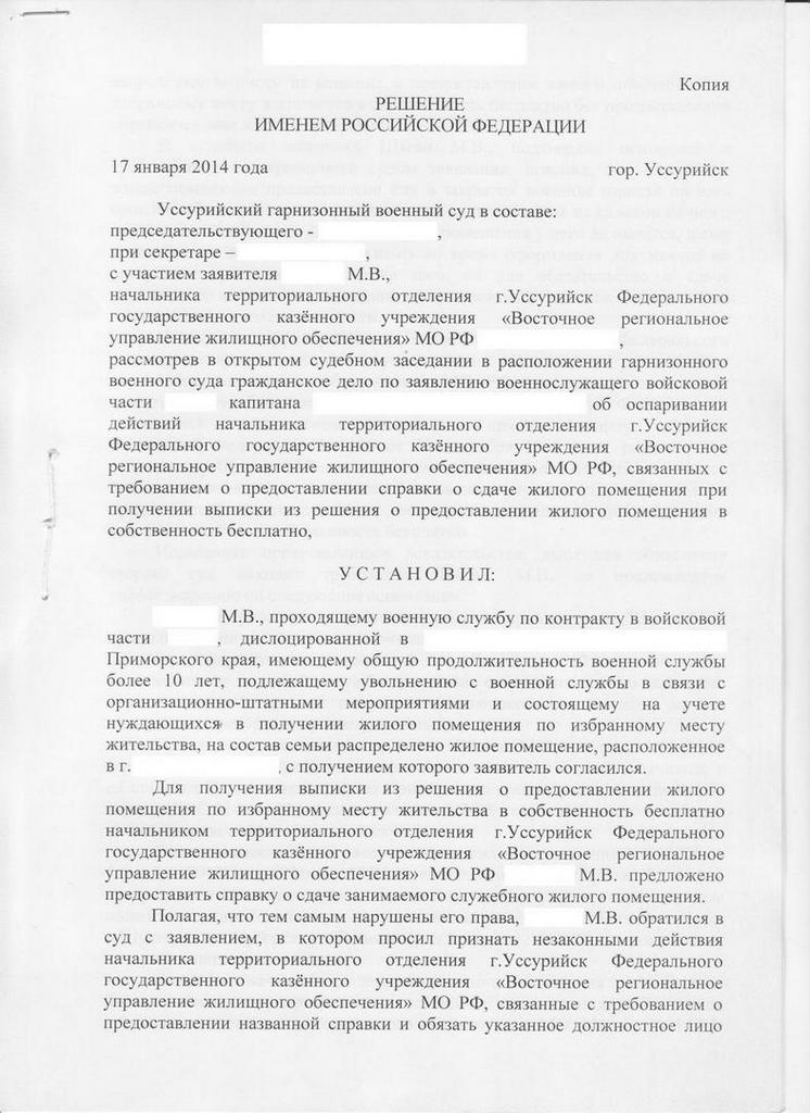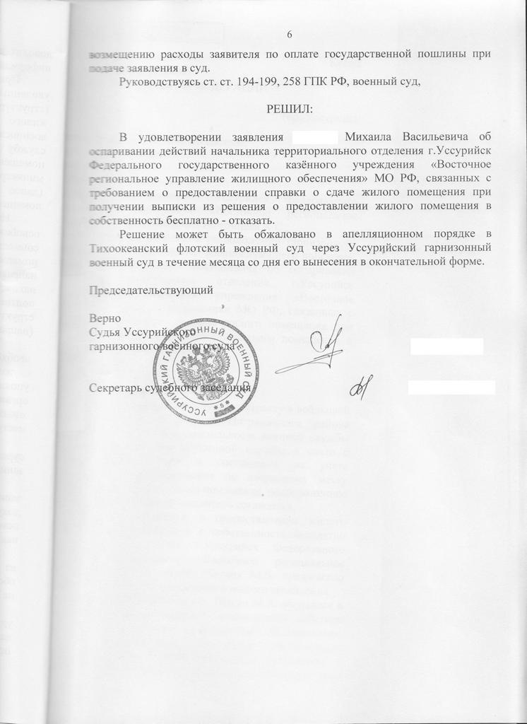 Была направлена апелляция в суд ТОФ. Итог: решение гарнизонного суда оставить без изменени...Всем доброго времени суток! Ситуация следующая. Нахожусь в распоряжении командира части с 2009 года, ОШМ. В ноябре пришло извещение на квартиру, согласился. Соответственно через некоторое время пришло письмо из тер. отдела о необходимости прибыть за выпиской из решения. Так же в в письме было указано какие документы предоставить, среди них пресловутая справка о сдаче служебки. Соответственно после этого я обратился с заявлением к нач. тер. отделения ВРУЖО с просьбой выдать решение без предоставления справки. Мне было отказано. После этого я обратился в суд с заявлением об оспаривании действия нач. тер. отд. ВРУЖО в части требования от меня справки о сдаче. Суд встал на сторону ВРУЖО и отказал мне в моих требованиях. Может я что то не так сделал??? Подскажите куда и что дальше делать?Решение выкладываю.