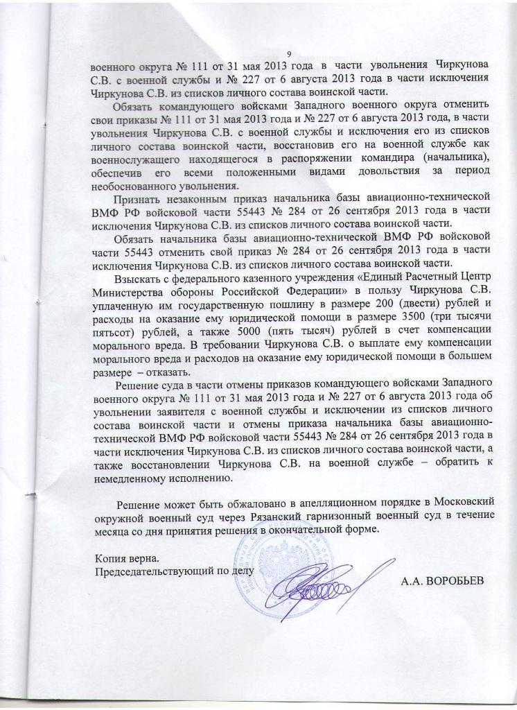 Дорогие друзья и сочувствующие, сегодня принесли заказным письмом с уведомлением о вручении. Ну, что можно сказать, без мата сказать невозможно, просто правовой НИГИЛИЗМ в кубе :lol: . Особенно прошу всех обратить внимание на то, что судья действительно думает, что техник учебно-тренажерного комплекса войсковой части 20924 уполномочена принимать документы у военнослужащих. А я и не зал :D Также поразительно то, что про пункт 59 Положения “О квартирно-эксплуатационной службе и квартирном довольствии Советской Армии и Военно-Морского Флота”, утвержденного приказом Министра обороны СССР № 75 от 22 февраля 1977 года (с изменениями от 26 июня 2000 г., 1 сентября 2008 г., и 2 мая 2012г.) где четко и недвусмысленно указанно, что обязанность по аренде жилых помещений для военнослужащих возложена на воинские части, в решении странным образом не рассматривалось. Это первые впечатления. Да, прошу всех кому интересно, делится мыслями, на что мне сделать упор при написании апелляции. Выкладываю саму жалобу в суд, объяснение и само решение. Заранее спасибо!
