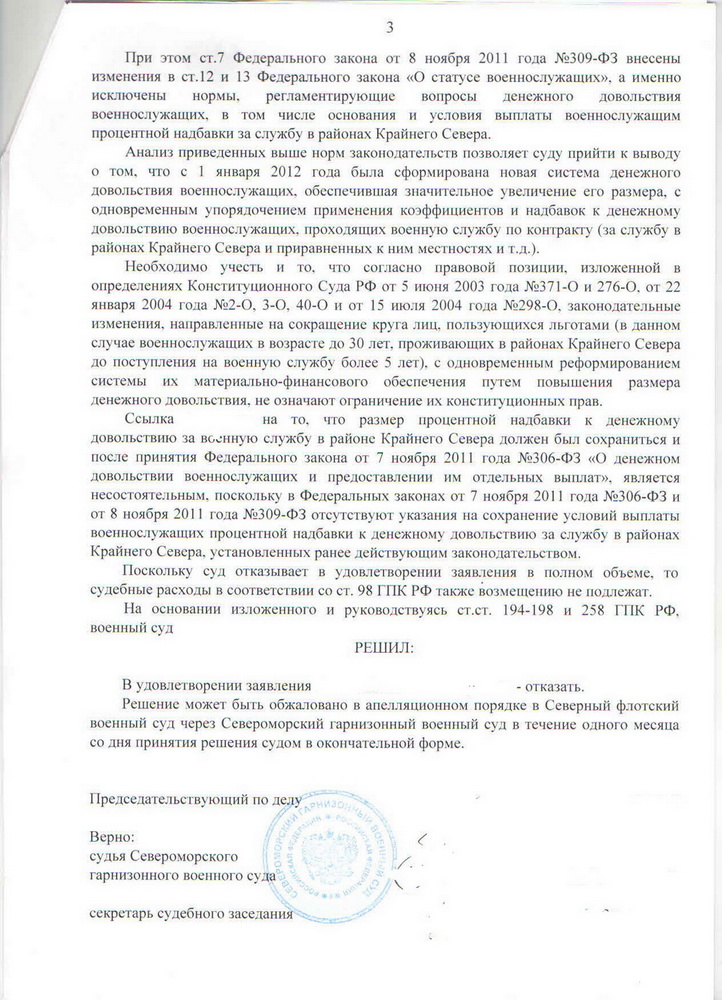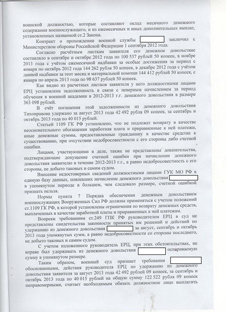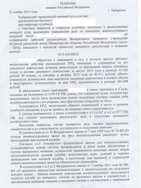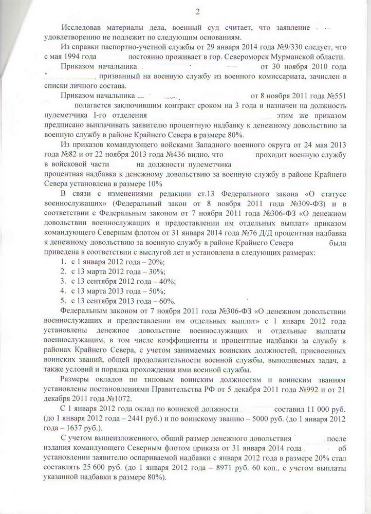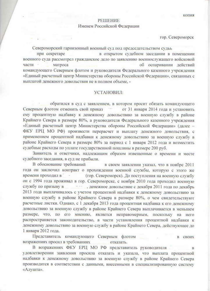 Подал заявление в гарнизонный североморский суд, на оспаривание будущего приказа с заработком полярок (с 20% до 60%) командующего СФ, в дополнение пытался обязать руководителя ЕРЦ доплатить удержанное мне ранее ДД.