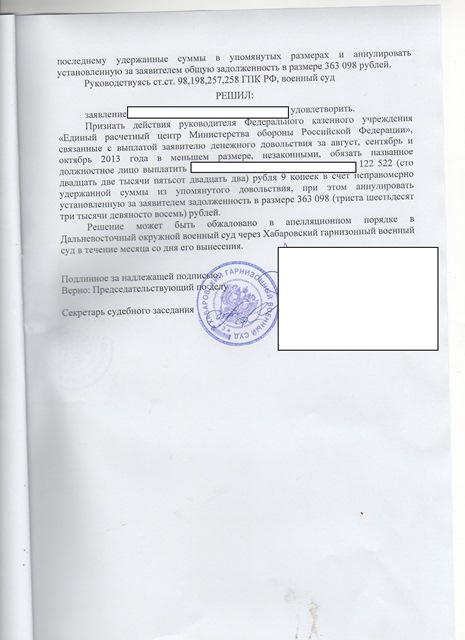 что то я не понимаю, какая помощь вам нужна, гарнизонный суд удовлетворил ваши требования, окружной оставил решение без изменений, а вам чего хочется???? чтобы вышестоящий суд отменил решение ГВСвыкладываю и жду помощи, решение апелляционного суда не дали просто зачитали оставить жалобу без удовлетворения оставить решение гарнизонного суда без изменений