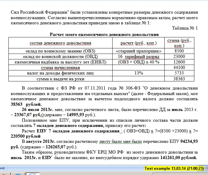 Ребята, я нахожусь в процессе судебного производства, по моему делу 14.02.2014 г. вынесено определение: "производство по гражданскому делу.... связанных с удержанием денежных средств из его ДД, приостановить до вступления в законную силу решения Военной коллегии Верховного Суда РФ от 25.11.2013 г. по гражданскому делу № ВКГПИ 13-49". То есть Благодаря Вам и Вашей помощи у меня всё срастается. Я уже один суд выиграл, просто они всё равно продолжают снимать. Но тут, когда я второй раз подал заявление, судья вручил мне копию решения ВС по Демиденко и когда я его прочитал спросил: "ну что, понравилось чтиво?" Я говорю -"нет", Ну тогда, говорит, подождём? Я говорю : -Ага! И вот, судя по Вашей информации, всё у меня должно получиться. Я надеюсь, что в скором времени меня должны вызвать опять в суд, для окончательного решения по моему делу. Я правильно понимаю? Так вот, после февральской зарплаты, я подсчитал, что с меня сдёрнули уже больше чем начислили, а ЕРЦ утверждает, что я ещё им должен. Вот я и спрашиваю Вас, кто мне может официально правильно подсчитать, куда я с этим могу обратиться? Служу я в Советской Гавани Хабаровского края, и судья у нас тоже нормальный.