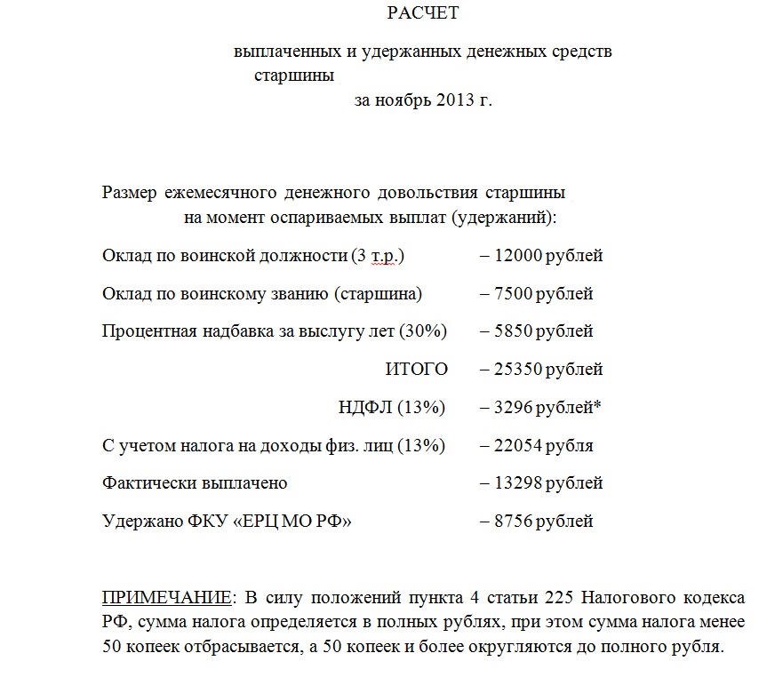 Зайдите на сайт https://cabinet.mil.ru/Login.aspx?ReturnUrl=%252f (ставьте галочку зайти без регистрации)- там сформированы расчетные листы с ЕРЦ начиная с мая 2012 года по настоящее время. Там Вы узнаете полную информацию сколько Вам платили и сколько снимали. Правда, там есть сообщение что листы расчета ДД за 2012 год будут доступны только до 01 апреля 2014 года.Спасибо ребята за поддержку, но, всё-таки как на счёт "куда обратится, что бы подсчитать"?