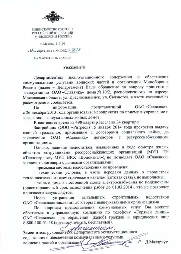Я уже писал выше об отписках от президента и МО. Вчера пришло письмо из славянки ( хотя я туда запрос не отправлял).но как видно этот круговорот нам не победить.