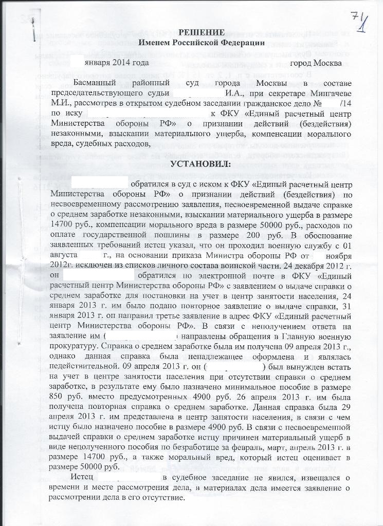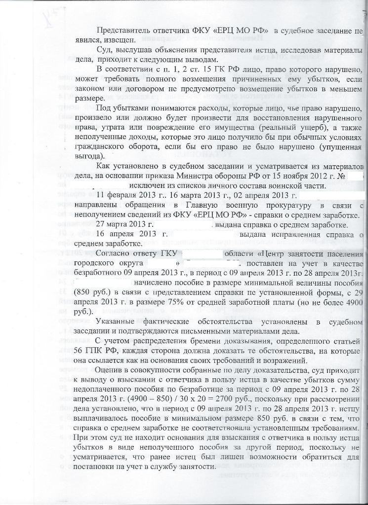 " Выше перечисленные действия (бездействия) руководителя ЕРЦ МО РФ, связанные с нарушением им установленного порядка рассмотрения обращения граждан Российской Федерации, в соответствии с ФЗ РФ от 2 мая 2006 г. N 59-ФЗ – несвоевременным рассмотрением моего ОБРАЩЕНИЯ с просьбой о предоставлении мне необходимой справки о моей средней заработной плате (денежного довольствия) причинили мне материальный ущерб в виде невыплаченного мне пособия по безработице за февраль, март, апрель 2013г. которое я мог бы получить в случае своевременного рассмотрения руководителем ЕРЦ МО РФ моего обращения от 24 декабря 2012 года и своевременного ответа по существу обращения в виде отправки мне необходимой справки о моей средней заработной плате, а так же причинили мне моральный вред (нравственные страдания).