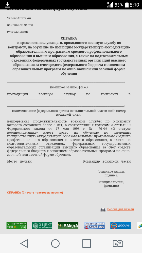 так то и не обязанQR_BBPOST И в ВУЗе мне никто ни слова не говорил о нейслабакQR_BBPOST КЧ сдалсяхорошо что мы поняли друг другаQR_BBPOST В этой справке написано "за счет средств федерального бюджета". Правильно ли я понимаю, что это означает, я НЕ БУДУ ПЛАТИТЬ ЗА УЧЕБУ, ЗА МЕНЯ БУДЕТ ПЛАТИТЬ ГОСУДАРСТВО?тогда и отпуска может не бытьQR_BBPOST Я поступаю и буду оплачивать обучение из своего карманане нужна, так же как и отпускQR_BBPOST . А раз я обучаюсь за собственные средства, тогда зачем мне эта справка?да, так как иного обучения не предусмотрено.QR_BBPOST А в законе и постановлениях написано, что основанием получения высшего образования ЗА СЧЕТ СРЕДСТВ ФЕДЕРАЛЬНОГО БЮДЖЕТА ЯВЛЯЕТСЯ СПРАВКА, ВЫДАВАЕМАЯ КОМАНДИРОМ ЧАСТИ, В КОТОРОЙ ВОЕННОСЛУЖАЩИЙ ПРОХОДИТ СЛУЖБУ
