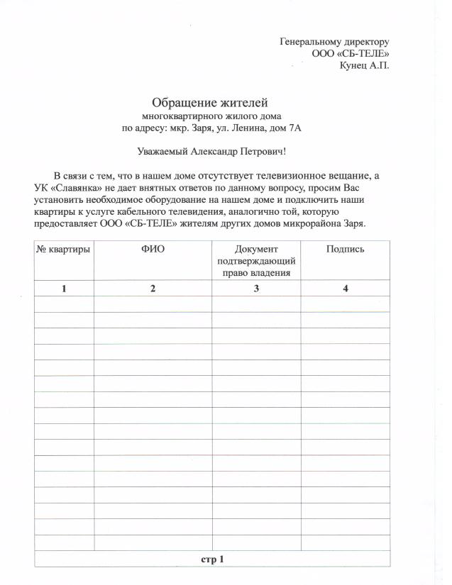 При посещении ООО "СБ-ТЕЛЕ" при себе необходимо иметь документ, подтверждающий право на проживание в квартире (ДСН, Свидетельство о собственности). Ниже приведена форма обращения. Необходимо собрать не менее 20 подписей.
