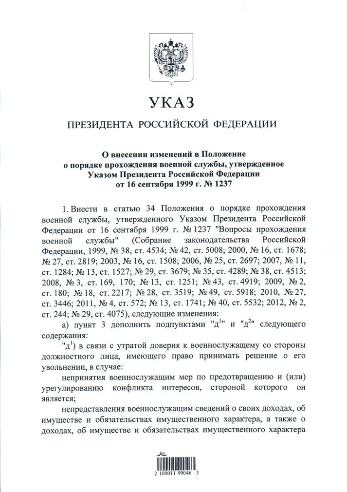 Ничего особенного... Просто привели НПА военных в соответствие с требованиями к гражданским , а именно, со статьёй 59.2." Увольнение в связи с утратой доверия (введена Федеральным законом от 21.11.2011 N 329-ФЗ)" ФЗ "О ГОСУДАРСТВЕННОЙ ГРАЖДАНСКОЙ СЛУЖБЕ РОССИЙСКОЙ ФЕДЕРАЦИИ" № 79 -2004 г. Борьба с коррупцией, однако...Никита писал(а):Указ Президента Российской Федерации от 13.11.2012 № 1525