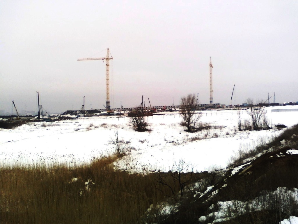 2.Собранных и установленных кранов - два. Ожидающих установки - тоже, похоже, два (не понять, когда конструкции сложены на земле).