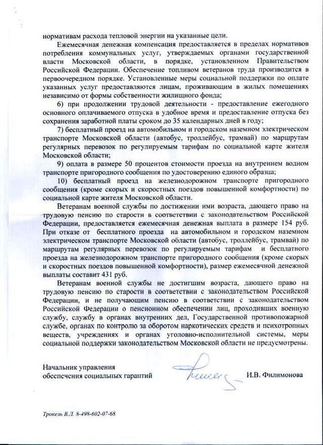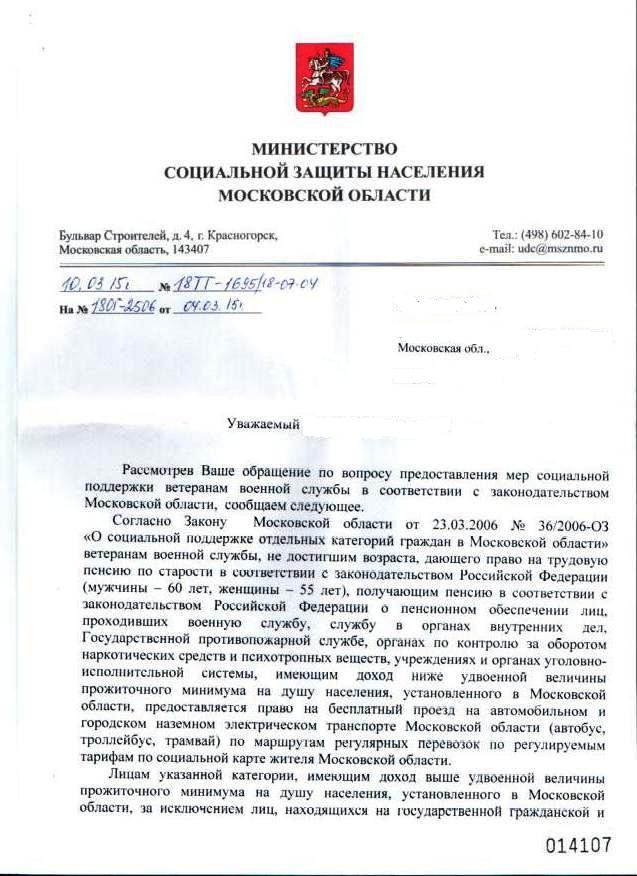 #1055Непонятно только в конце .. Как можно стать ветераном ВС и при этом не получать пенсию по 4468-1Дорогие друзья и сочувствующие, для того чтобы прекратить споры, какие льготы положены "Ветеранам военной службы", в Московской области, представляю ответ из Министерства социальной защиты населения Московской области.
