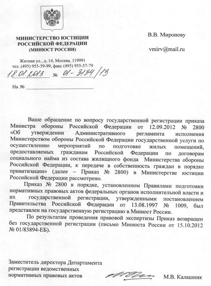 ПРИВАТИЗАЦИЯ под вопросом: Приказ МО РФ № 2800 (Административный регламент) возвращен МинЮстом
