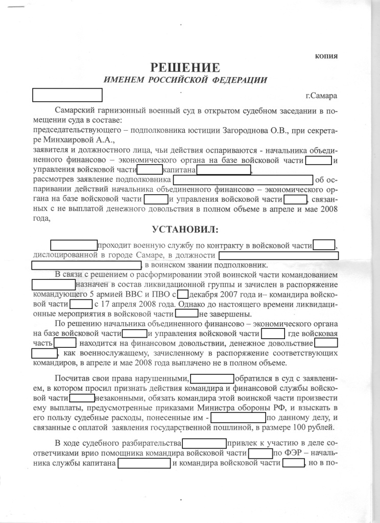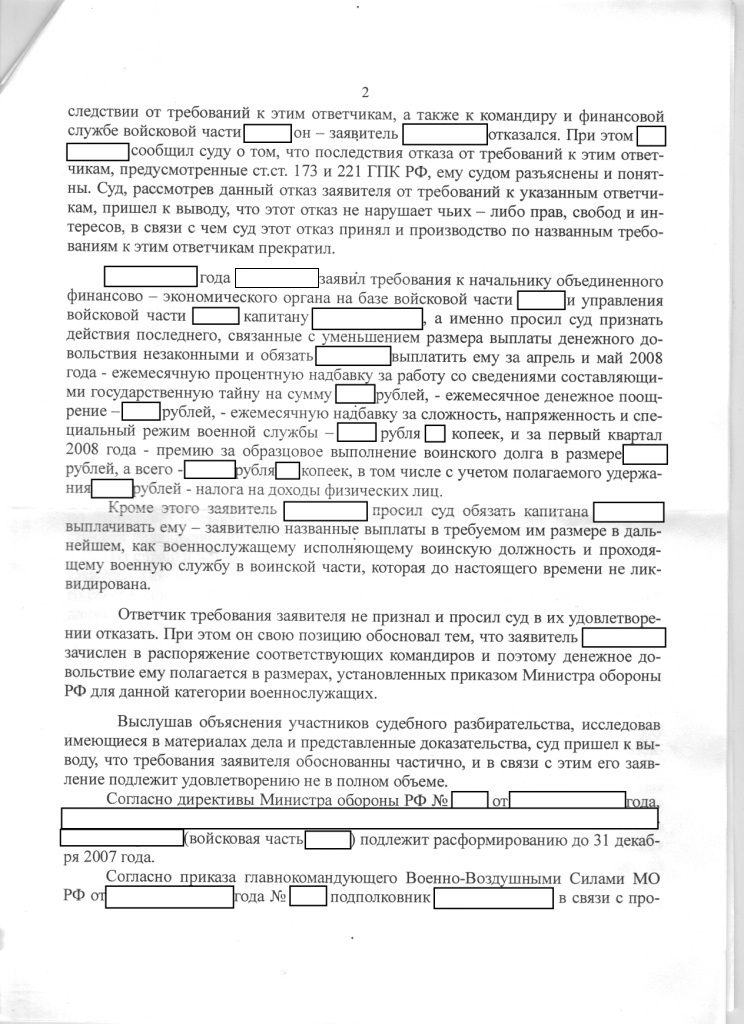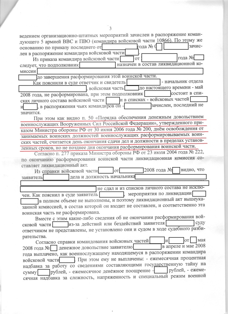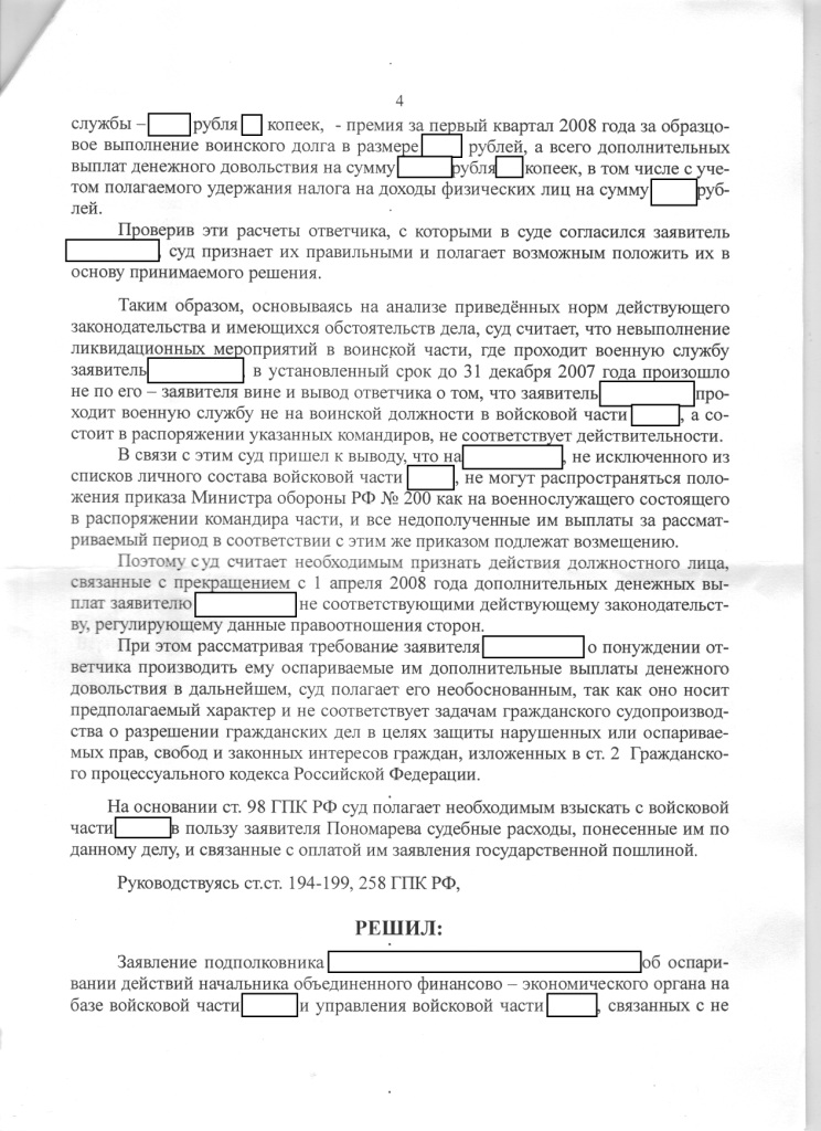 #11093Так как дискуссия идет от моего сообщения, рискну выложить решение суда по мне:Вы приводите все данные о том, что пока военнослужащего приказом по части не вывели в распоряжение и не посчитали сдавшим дела и должность, то ему должны платить как находящемуся на должности, но при этом доказываете, что такого не бывает. Да в приказе 200 была ст. 51, согласно которой при проведении ОШМ военнослужащему переставали платить как находящемуся на должности, но судебная практика стала доказывать обратное. И то что лично Вам и Вашим товарищам не повезло с судьей, не может служить доказательством, что это не так. Беда в том, что мы в основном в суде пытаемся опереться на ФЗ, забывая о таком виде доказательств как свидетельские показания. А это не мало важно.Я в курсе. Или Вы или я чего-то не понимаю.