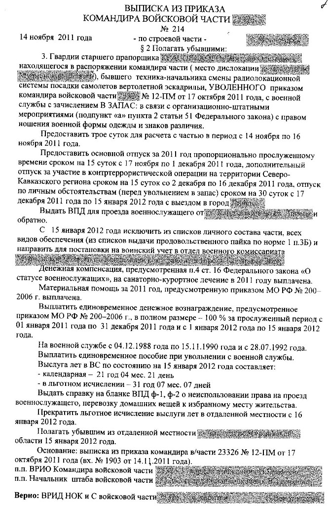 Уволен приказом от 17.10/2011 досрочно (ОШМ) с выслугой 21,4 календарь и 31,8 льготной выслуги. Доведено под роспись 14.11.2011. Приказом по части предоставлено 3 суток на расчет с 14.11.2011 и с 17.11.2011 на основании моего рапорта предоставлены отпуска (15 оставшейся части основного+15 дополнительного чеченского+30 дополнительного при увольнении). Исключают из списков части 15.01.2012.