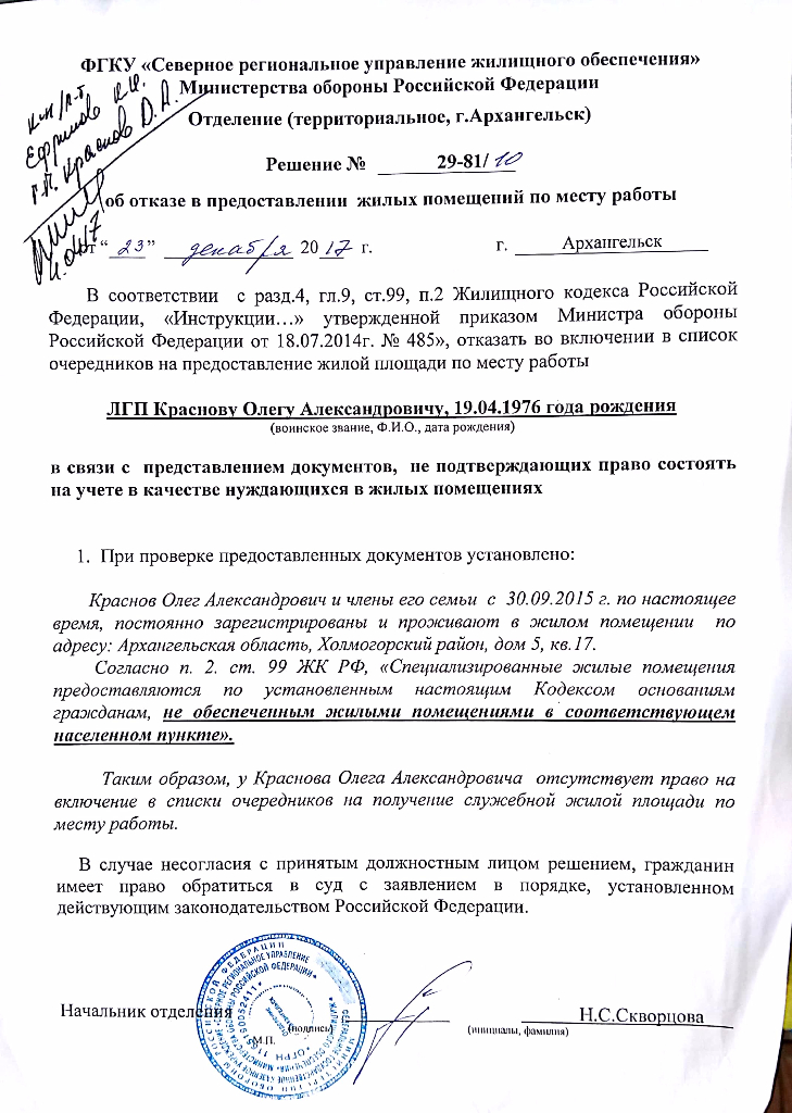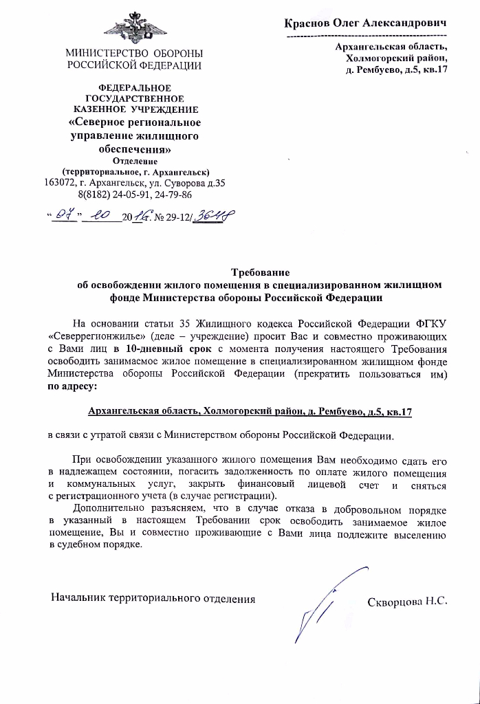 Местное Архангельское РУЖО два раза в 2016 году вынесло мне решение о принудительном выселении в связи с «утратой связи с МО РФ». Так же мной в 2016 году были поданы документы на получения служебного жилья по месту работы согласно приказа МО РФ №485 от 2014 года по адресу по которому проживаю уже, с последующим заключением договора с управляющей компанией.