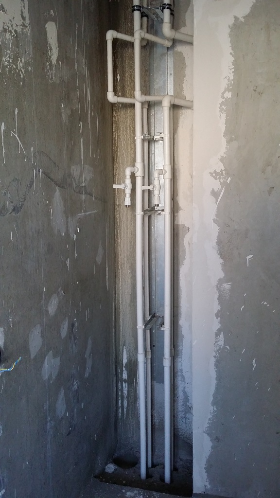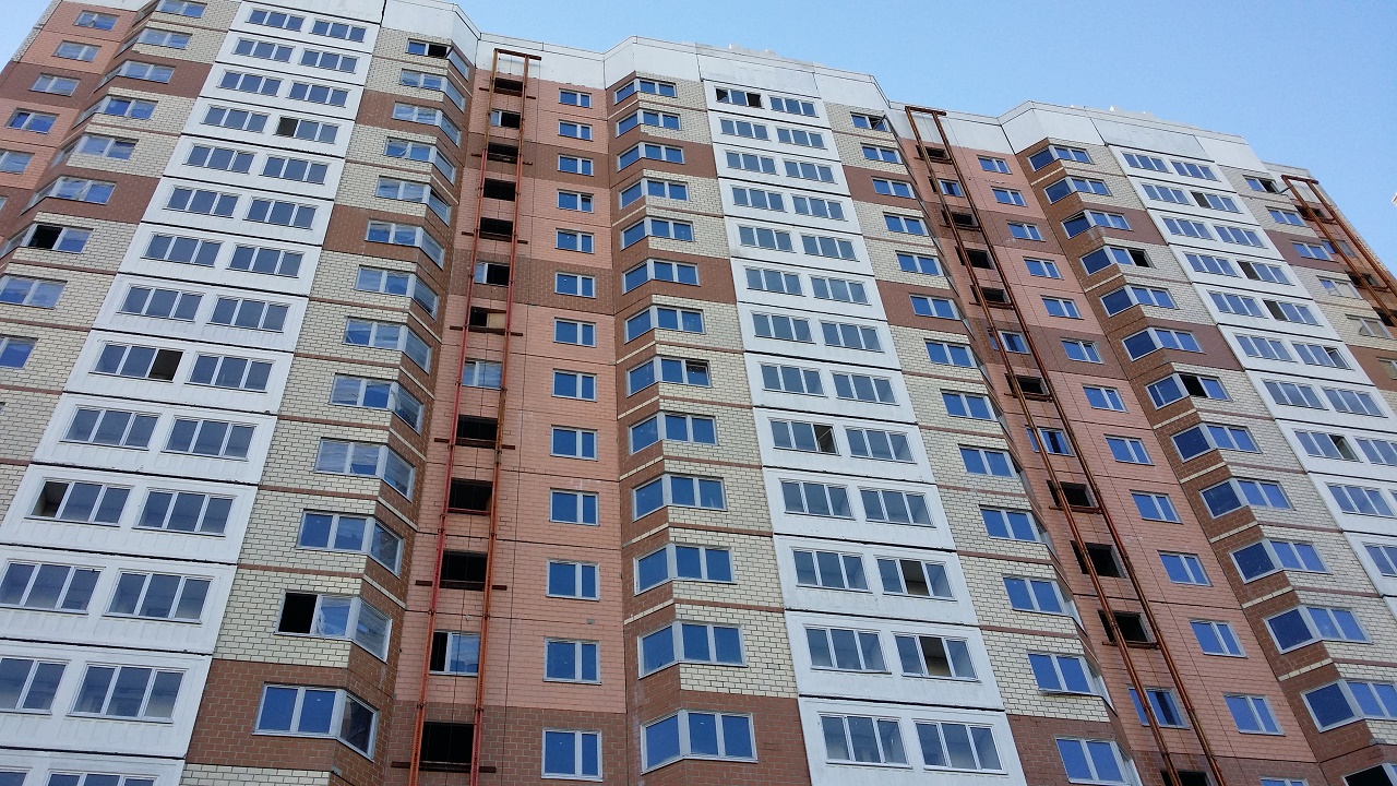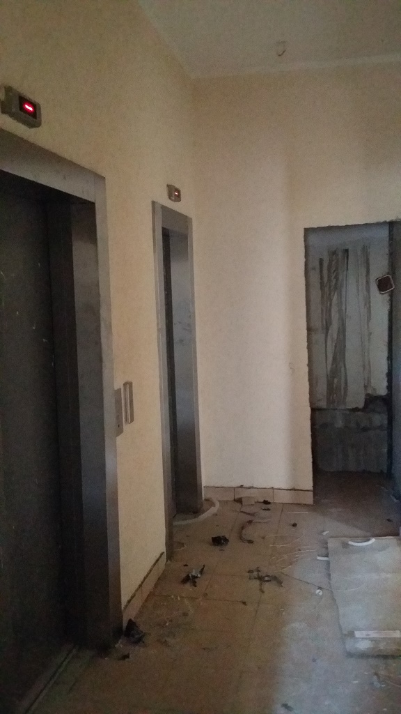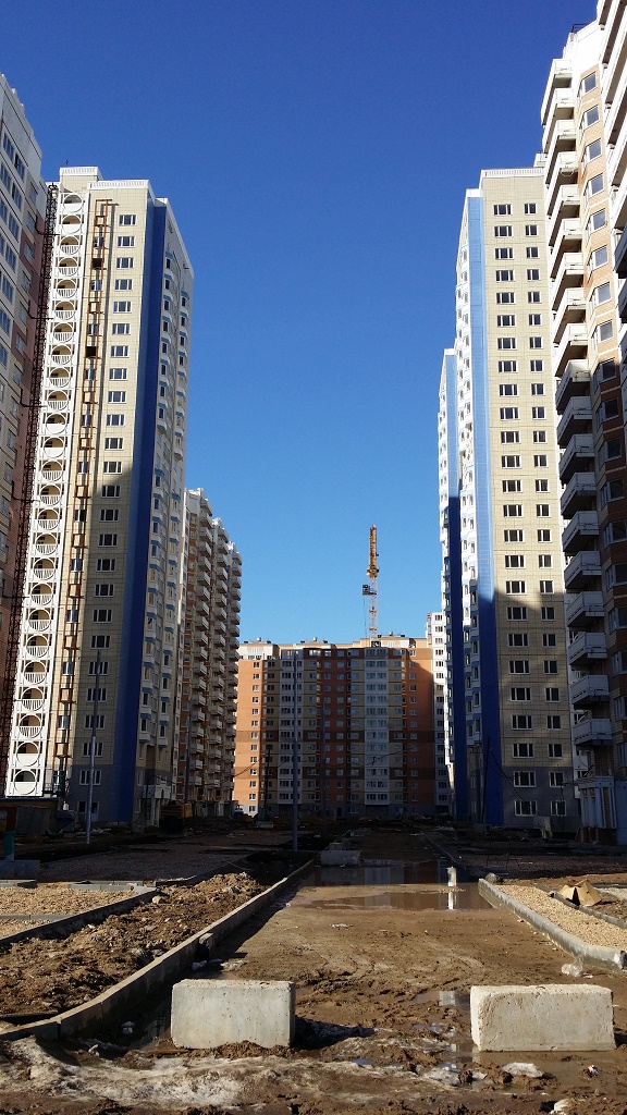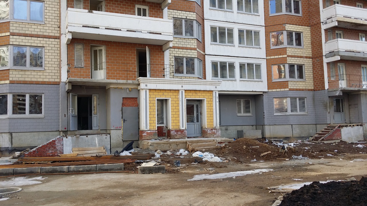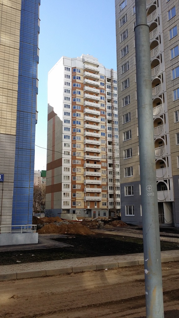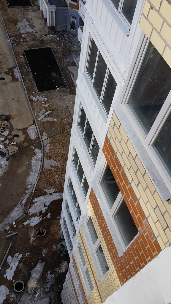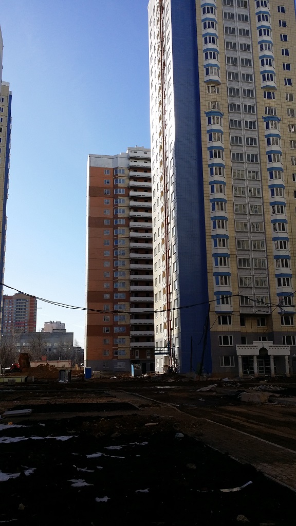 Наблюдали только серые стены без дверей и без труб по стоякам. Позже появились лебедки со стороны фасада. Видимо за это время сделали коммуникации и все остальное, что видно на фото.