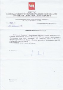 Вчера получен ответ от депутата Мотовилова:#1097 » 08 окт 2012 Итак, обсудили проблемы. Завтра подаем обращение к Депутату Законодательного Собрания Челябинской области Мотовилову Александру Александровичу
