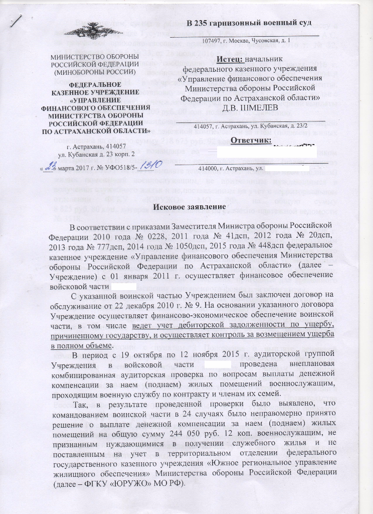#1168А тут неосновательное обогащение по ст.1102! ( компенсация за поднаем не входит в денежное довольствие)QR_BBPOST Упирайте на то, что сначала необходимо взыскивать с воинов неосновательное обогащение