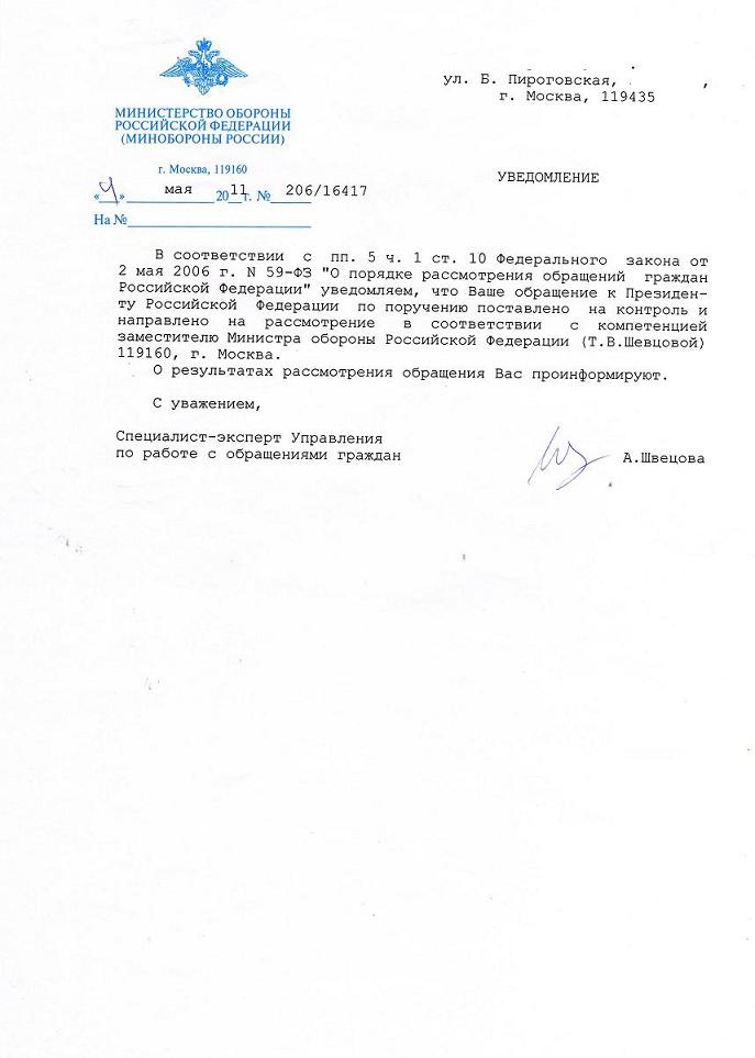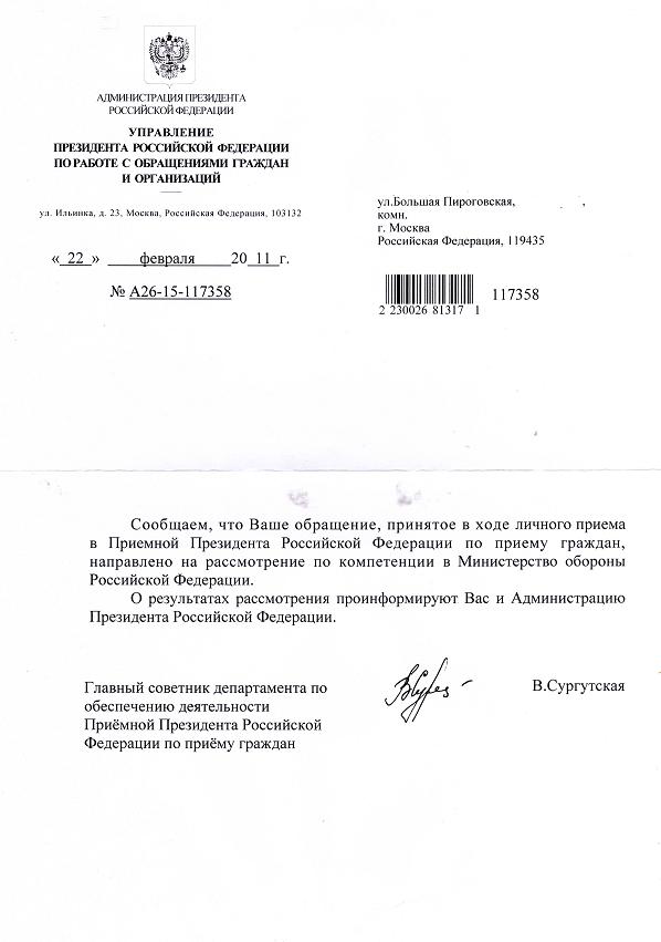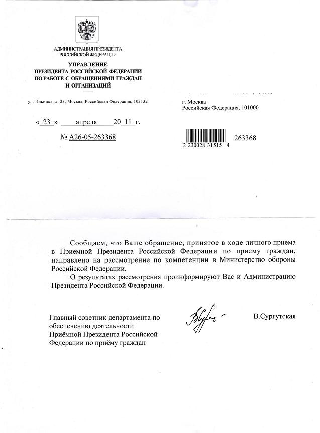 Только они все равно отписывают на рассмотрение в Минобороны. Плавали, знаем. :(