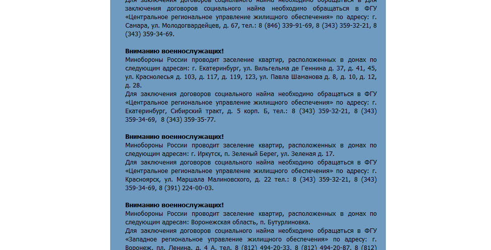 Для заключения договоров социального найма необходимо обращаться в ФГУ «Центральное региональное управление жилищного обеспечения» по адресу: г. Екатеринбург, Сибирский тракт, д. 5 корп. Б, тел.: 8 (343) 359-32-21, 8 (343) 359-34-69, 8 (343) 359-35-77.