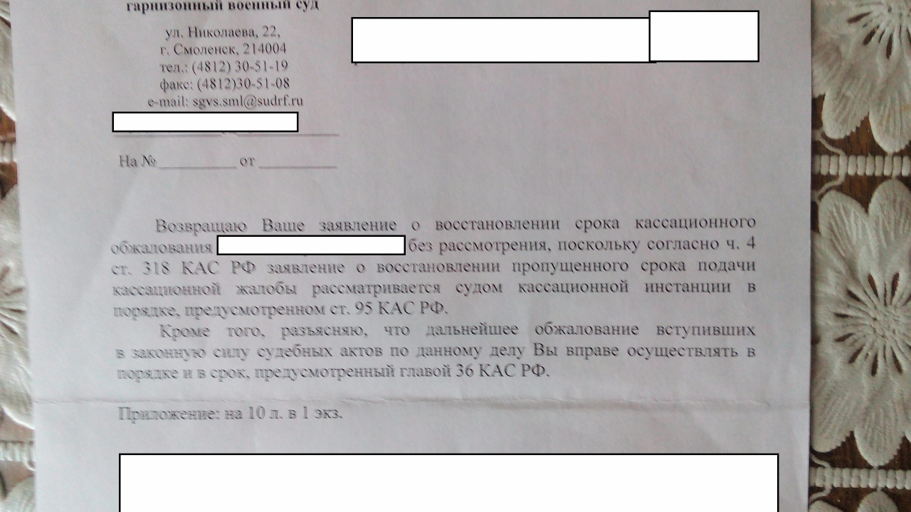 Позвонил, услышал почти то же самое, что при повторной подаче на Заместителя Председателя ВС РФ я обжалую только определение судьи, которое и направляю на зампреда суда, а как же сама кассационная жалоба, мне же вернули поданные экземпляры жалобы вместе с определением, оставив в суде только приложенные копии судебных постановлений. После этого звонка у меня возникли вопросы по содержанию. До звонка у меня были: жалоба на определение с доводами о его несостоятельности и просьбой его отменить и передать кассационную жалобу на рассмотрение, и как приложение к ней сама кассационная жалоба с доводами в отношении нарушения материальных прав, допущенных в ходе вынесения постановлений гарнизонным и окружным судами и требованием их отмены и вынесения решения по делу. Теперь, если я подаю жалобу только на определение судьи ВС, приводя доводы о нарушении материальных норм только в ответ на то, что указал судья в своем определении, я теряю ряд пунктов, по которым суды первичной и апелляционной инстанций допустили нарушения, поскольку о них судья ВС в своем определении не упоминал, кроме этого куда вставлять просьбу об отмене судебных постановлений, если по смыслу жалобы на определение я прошу его отменить и передать на рассмотрение то, что мне вернули и оно находится дома, а как следует из ответа консультанта прикладывать то, что вернули к повторной жалобе не нужно.