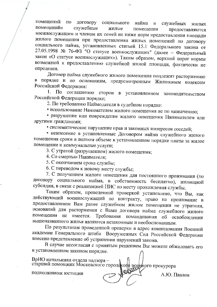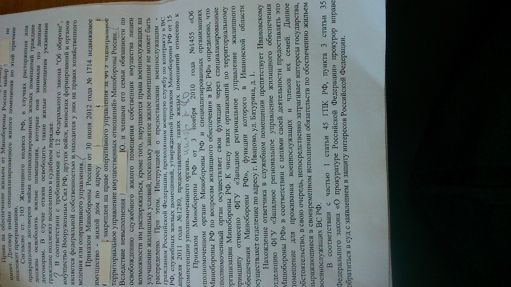 По оперативному управлению тоже есть сомнения. Права оперативного управления подлежат регистрации в Росреестре. Если этого не было сделано, то приказ МО РФ не выполнен, прав оперативного управления на Ваше жилое помещение ни у кого нет. Я бы попробовал такой аргумент: договор не может быть расторгнут, так как второй стороны нет - собственника.QR_BBPOST Военная ппрокуратура к иску не прикладывает документы на основании которых МО является собственником