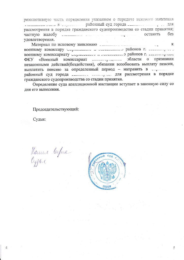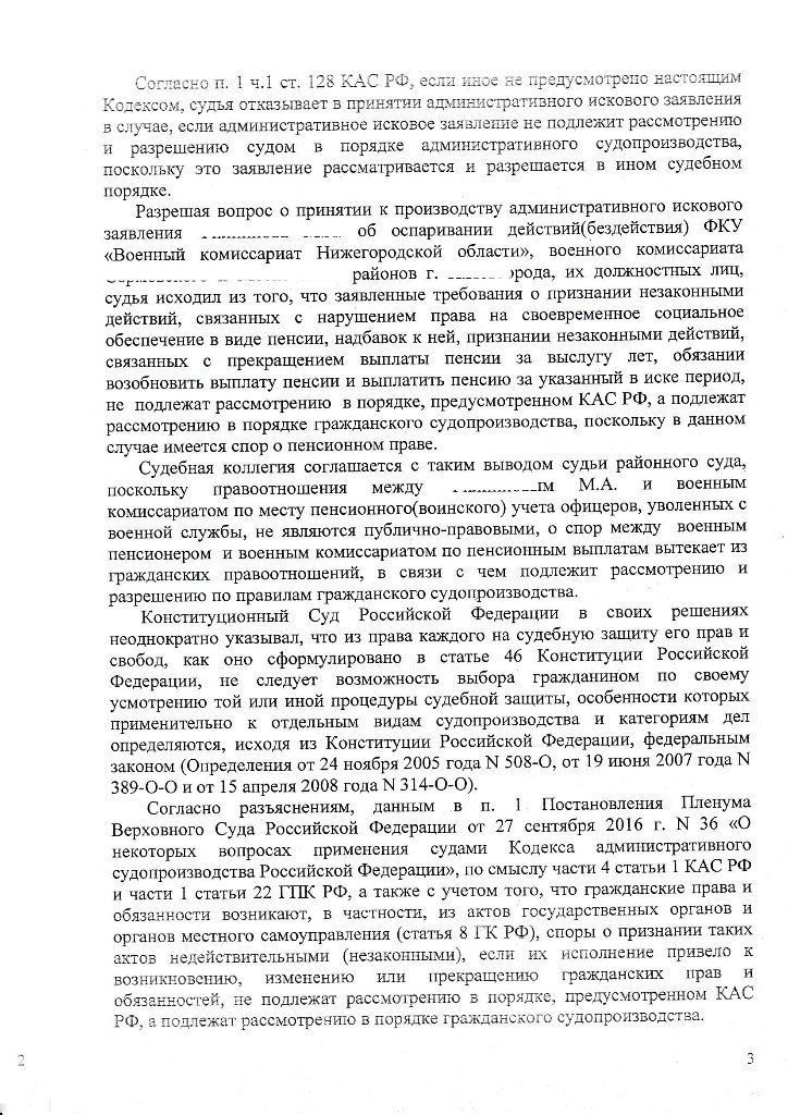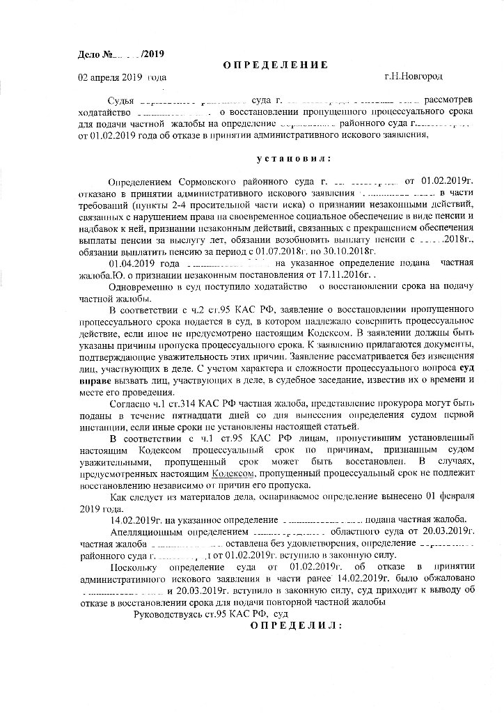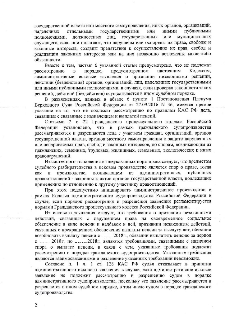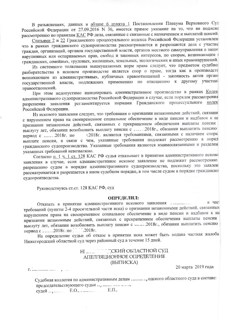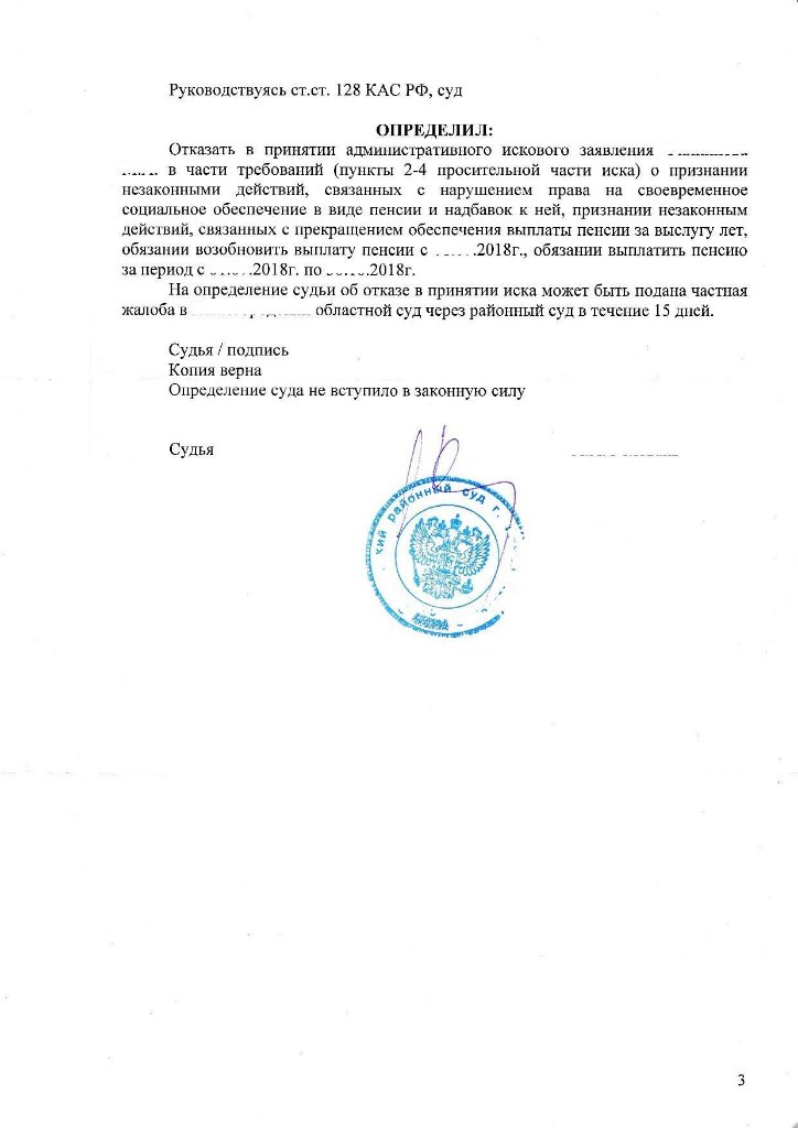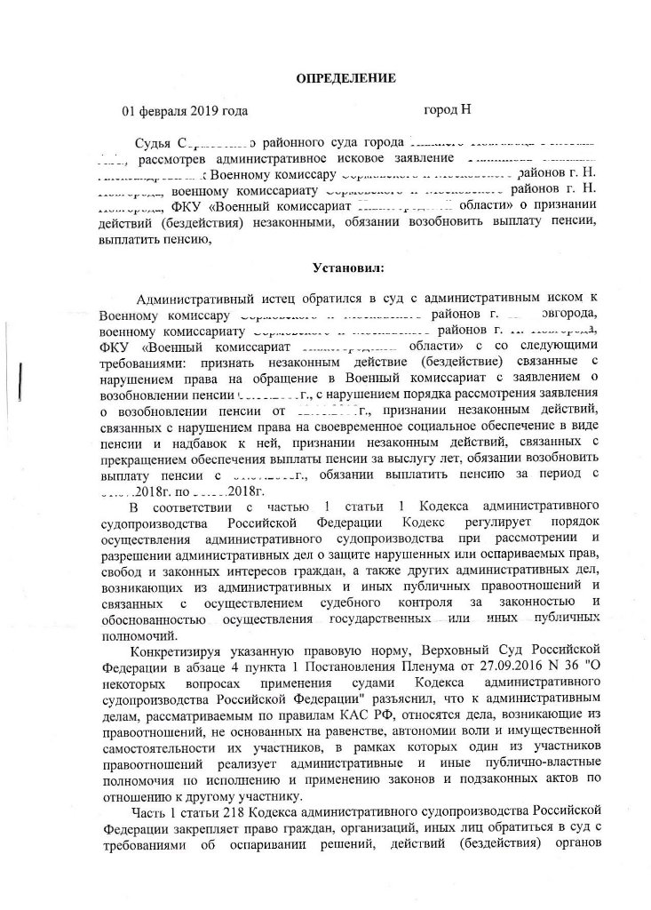 01 февраля 2019 г. суд вынес определение (лд.46 дела М-846/2019) об отказе мне в принятии заявления в части требований (пункты 2-4 просительной части иска) о признании незаконными действий, связанных с нарушением права на своевременное социальное обеспечение в виде пенсии и надбавок к ней, признании незаконным действий, связанных с прекращением обеспечения выплаты пенсии за выслугу лет, обязании выплатить пенсию с 00.00.2018 г. по 11.11.2018 г.
