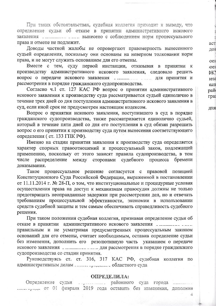 Обратился в суд с АИЗ в порядке гл.22 КАС РФ. Суд вынес определение об отказе в рассмотрении части требований, т.к. их необходимо рассматривать в порядке гражданского судопроизводства согласно ГПК РФ. Отправил ЧЖ на данное определение. Областной суд апелляционным определением оставил мою ЧЖ без удовлетворения, но указал районному суду о необходимости дополнить резолютивную часть определения указанием о передаче моего ИЗ в суд для рассмотрения в порядке гражд-го судопроизводства со стадии принятия.