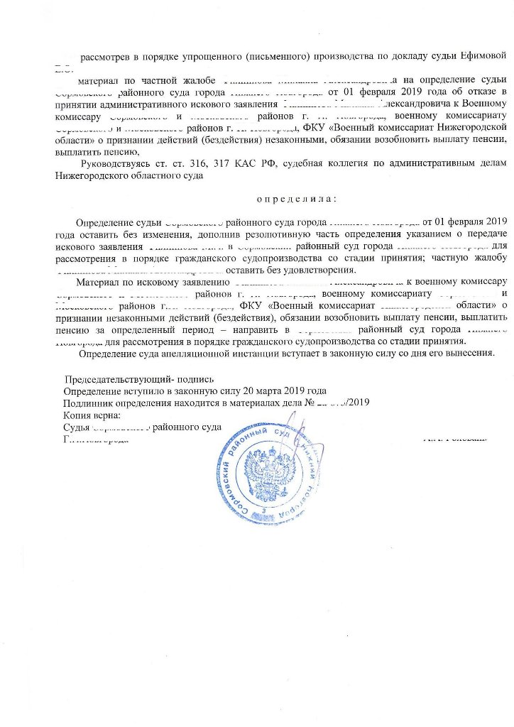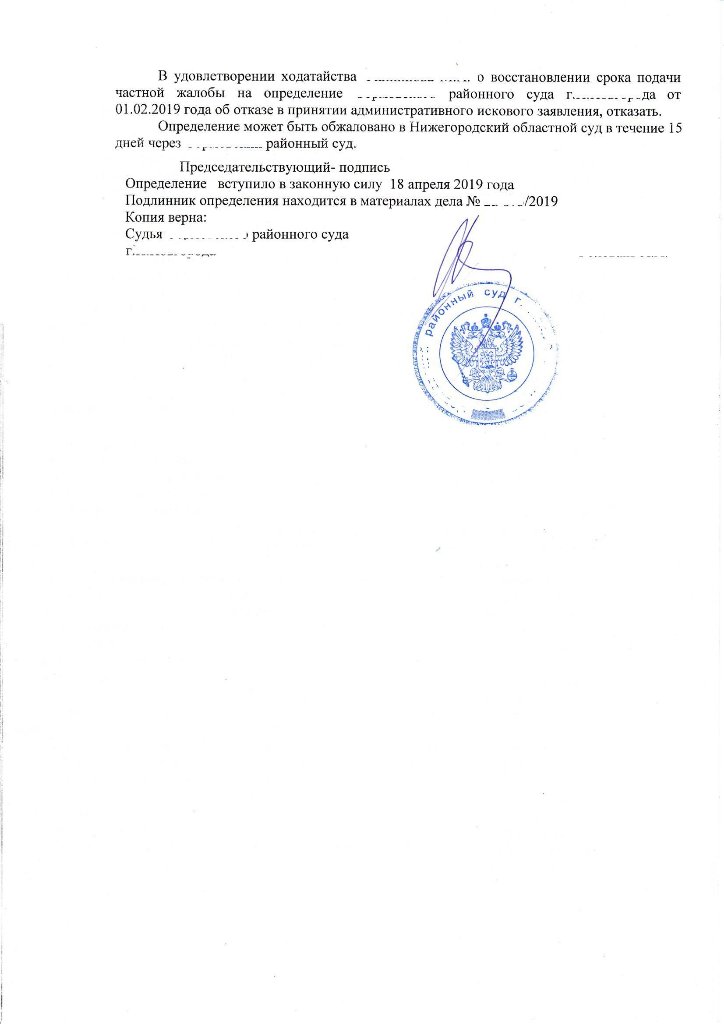 28.03.2019 г. суд вручил мне апелляционное определение Н-ского областного суда от 20.03.2019 г. и заверенное обжалуемое определение суда от 1.02.2019 г., согласно резолютивной части которого: