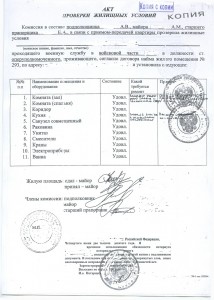 Наверное это только в армии, но у акта который называется "проверка жилищных условий" нет даты. В этом акте Указано что комиссия в составе...в связи с приемом -передачи квартиры проверила жилищные условия майора ...проходящего в/службу в в/ч ..проживающего по адресу...., согласно договора найма служебного жилого помещения и установила следующее: Далее идет таблица с перечислением оборудования и комнат и их состояние. Далее, жил. площадь сдал майор такой то, жил площадь принял майор такой то (то есть мой муж). Подпись членов комиссии.