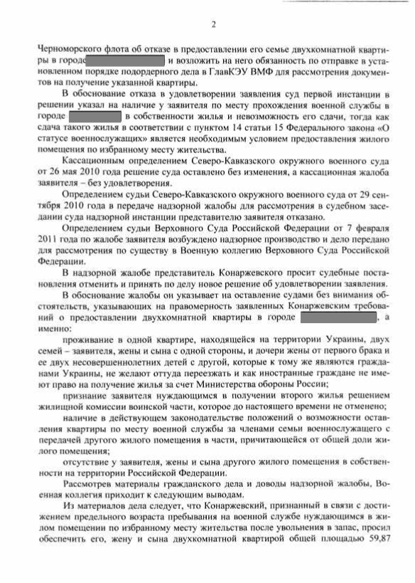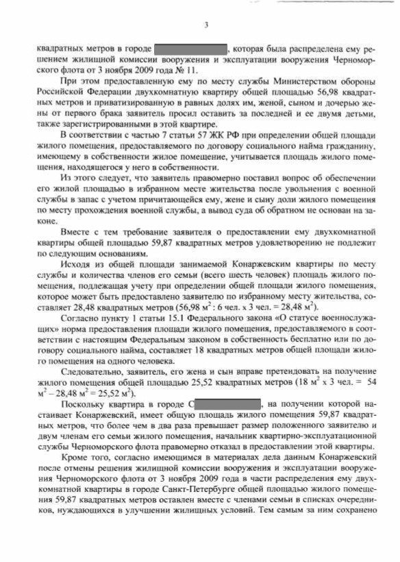 В 2006 году получил от МО двухкомнатную квартиру 64 кв.м. (комнаты 13,7 и 19,5 кв.м.) по договору соц. найма на себя, жену и несовершеннолетнего сына. Вскоре после этого жена подала на развод. В 2010 году перевёлся к новому месту службы в другой округ. Снова женился. Постоянная прописка по прежнему месту жительства. Здесь временная регистрация. Выслуга – 20 лет. Квартира до сих пор не приватизирована. Бывшая жена проживает там с сыном.