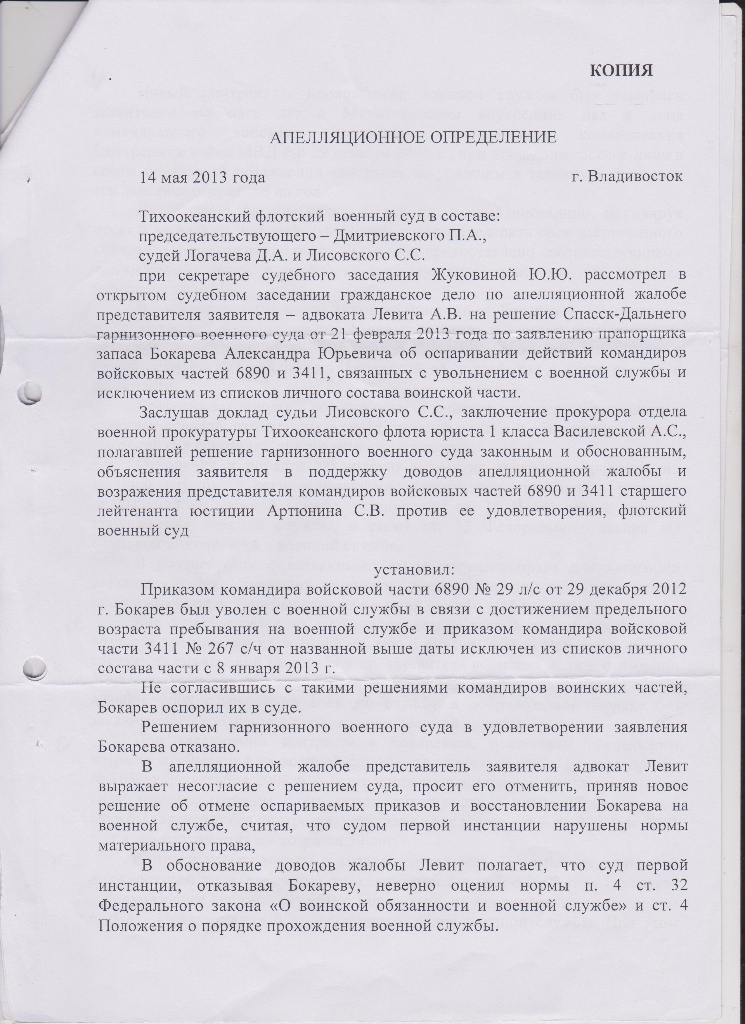 #1213Конституцией и мотивировать. Вообще первый раз слышу о решении суда в пользу командования по сроку контракта. Надо написать, что согласно ст. №? Конституции реализация прав командира части не должна нарушать прав других граждан, в частности Ваше право на труд. А командиром части нарушено Ваше право на труд и выбор срока контракта, который Вам предоставлен законодательством. При этом ссылаться, что право на подписание контракта заявительное и заявляется Вами; предоставленное данным судебным решением командиру части право выбора срока контракта делает бессмысленным само понятие контактной службы, так как в результате каждый командир части сможет изменять волеизъявление военнослужащего на срок до наступления предельного возраста.QR_BBPOST Чем мотивировать в апелляции?
