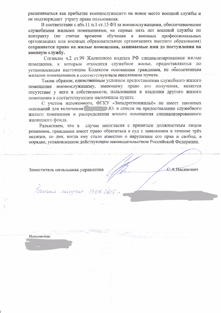 #12131Да какое ухудшение? Замполит не знает законов. На служебное ухудшение не распространяется. Внимательно прочитайте абзац 4 страницы 2 ответа из РУЖО. У Вас нет жилого помещения даже в пользовании, так как Вы съехали с места жительства у мамы. Вам же РУЖО в письме настоятельно рекомендовало обратиться в суд - отказ делается для того, чтобы снять с себя ответственность за предоставление Вам служебки при спорной ситуации и возможности обвинений со стороны проверяющих и военнослужащих-очередников.QR_BBPOST Зам.полит мне объяснил что я ухудшил свои жилищьные условия