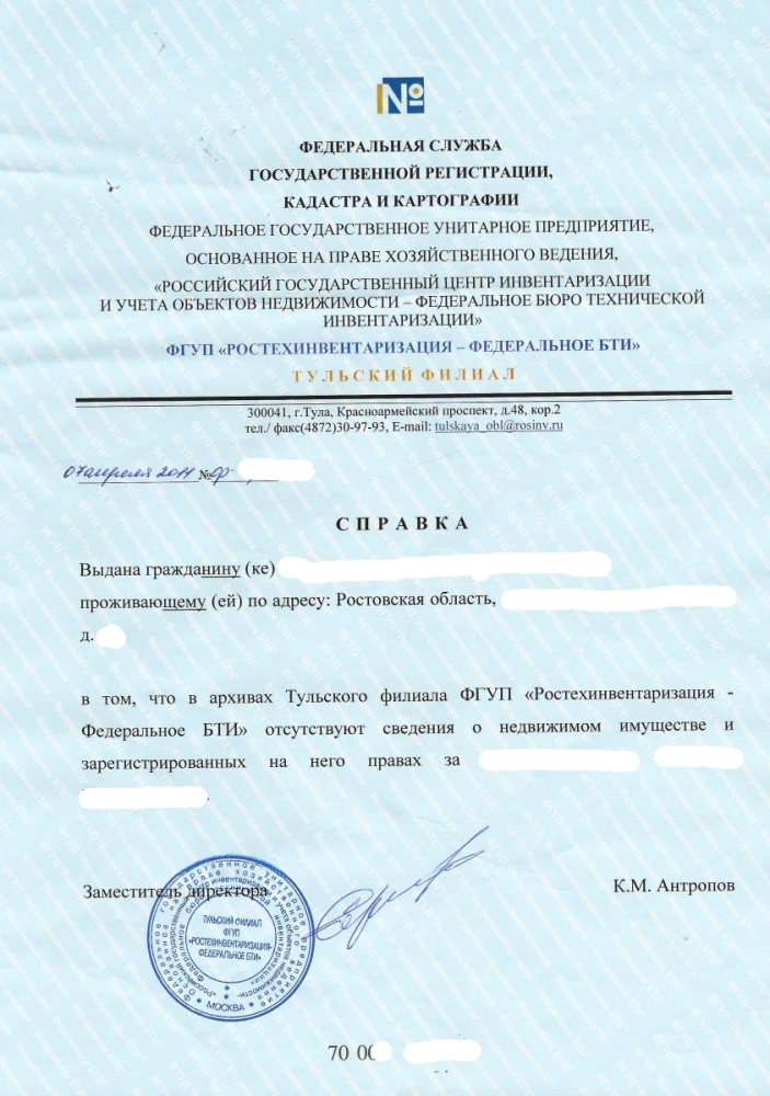 вот такую справку на фирменном бланке получил из Тульского БТИ