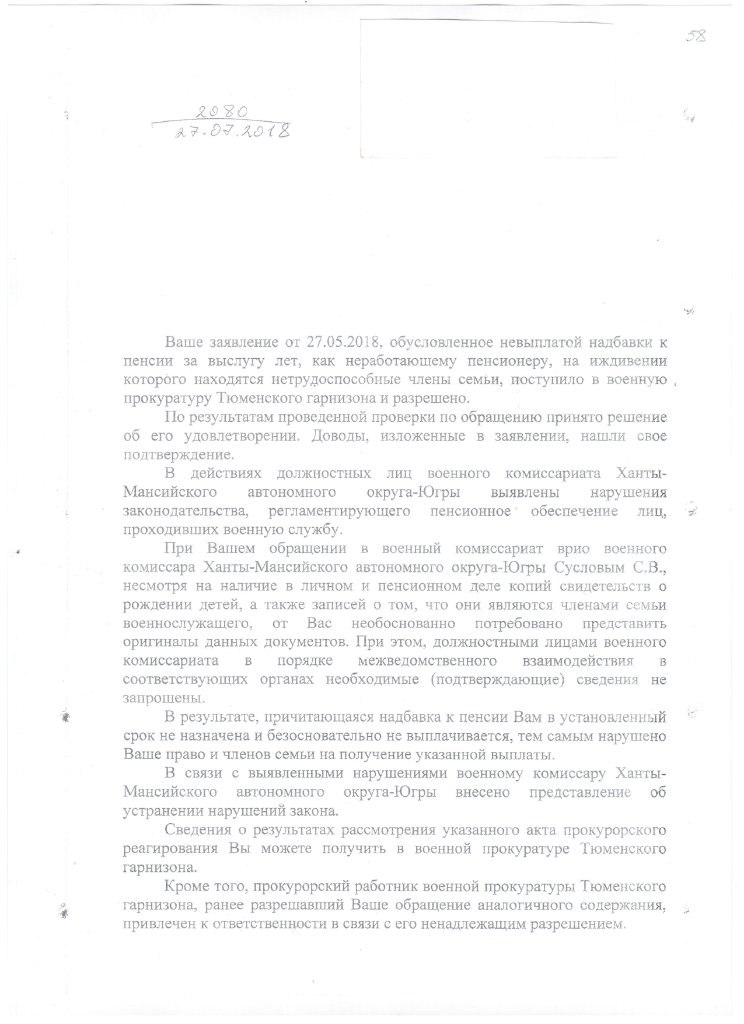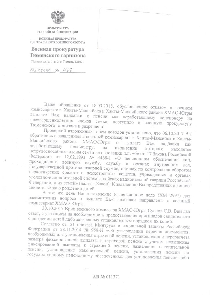 Повторная проверка военной прокуратурой Тюменского гарнизона выявила нарушения законодательства в действиях должностных лиц военного комиссариата Ханты-Мансийского автономного округа-Югры в пенсионном обеспечении заявителя, необоснованно потребовано представить оригиналы свидетельств о рождении двоих несовершеннолетних детей, несмотря на наличие в личном и пенсионном деле копий свидетельств о рождении детей, а также записей о том, что они являются членами семьи. В результате, причитающаяся мне надбавка к пенсии в установленный срок не возобновлена и безосновательно не выплачивается с июля 2017 года по настоящее время, тем самым нарушено мое право и членов моей семьи на получение указанной выплаты. (Копия письма из военной прокуратуры прилагается)