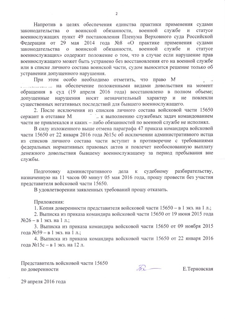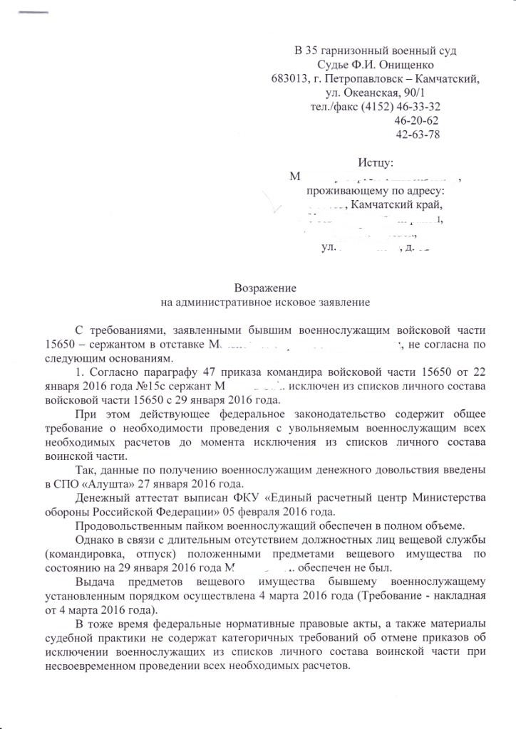 Получил возражения представителя командира на адм. исковое заявление об обжаловании приказа об ИСЧ.