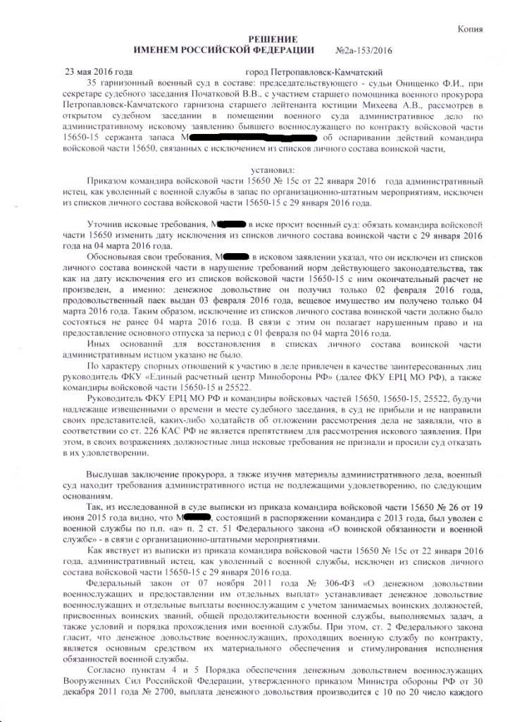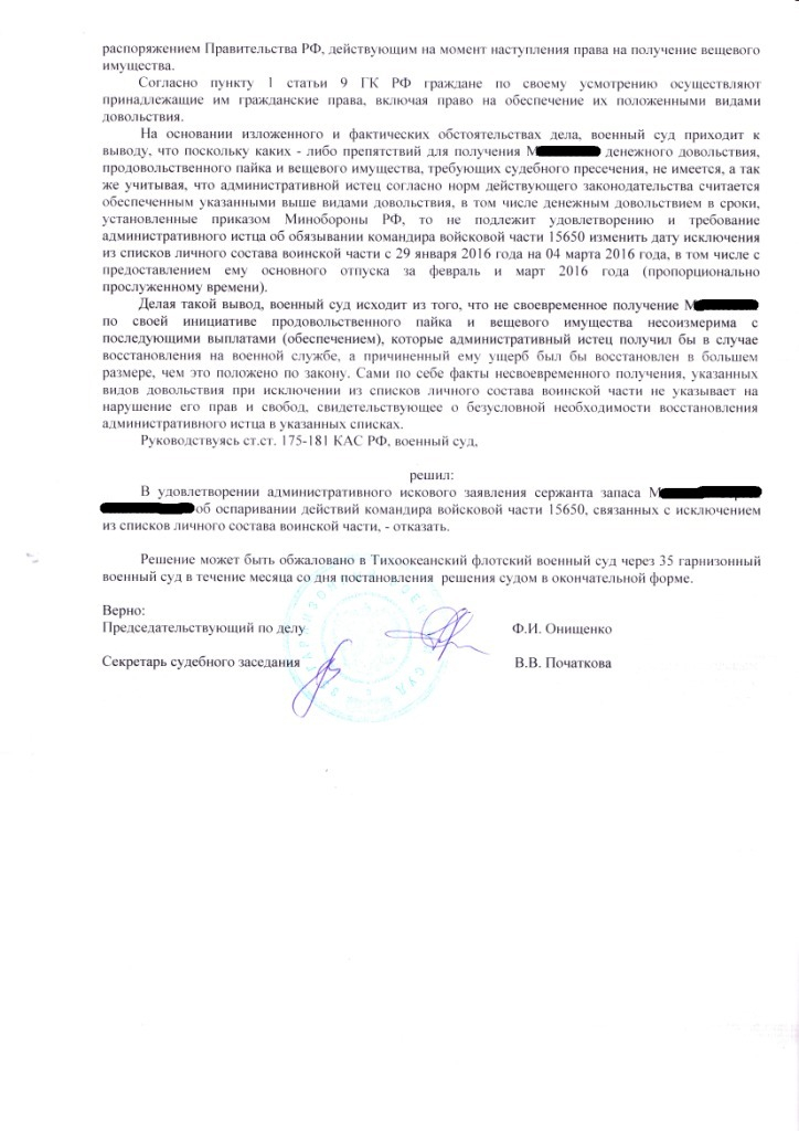 Решение суда должно основываться на доказательствах исследованных судом. А в данном решении судила основывается на отсутствующих доказательствах. Плюс обязанность доказывания законности приказа об исключении лежит на ответчике а не на истце. Это ответчик должен доказывать, что от вещевки склады уже десятый год ломятся, а воин под различными предлогами уклонялся от её получения и наказывали его уже и уволить грозились - а он гад сказал не буду получать ВИ и всё!