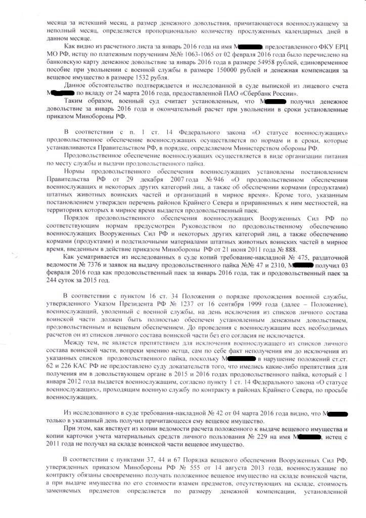 Представитель пишет: "право М**** на обеспечение положенными видами довольствия на момент обращения в суд (19 апреля 2016 года) восстановлено в полном объеме; допущенные нарушения носят незначительный характер и не повлекли существенных негативных последствий для бывшего военнослужащего."