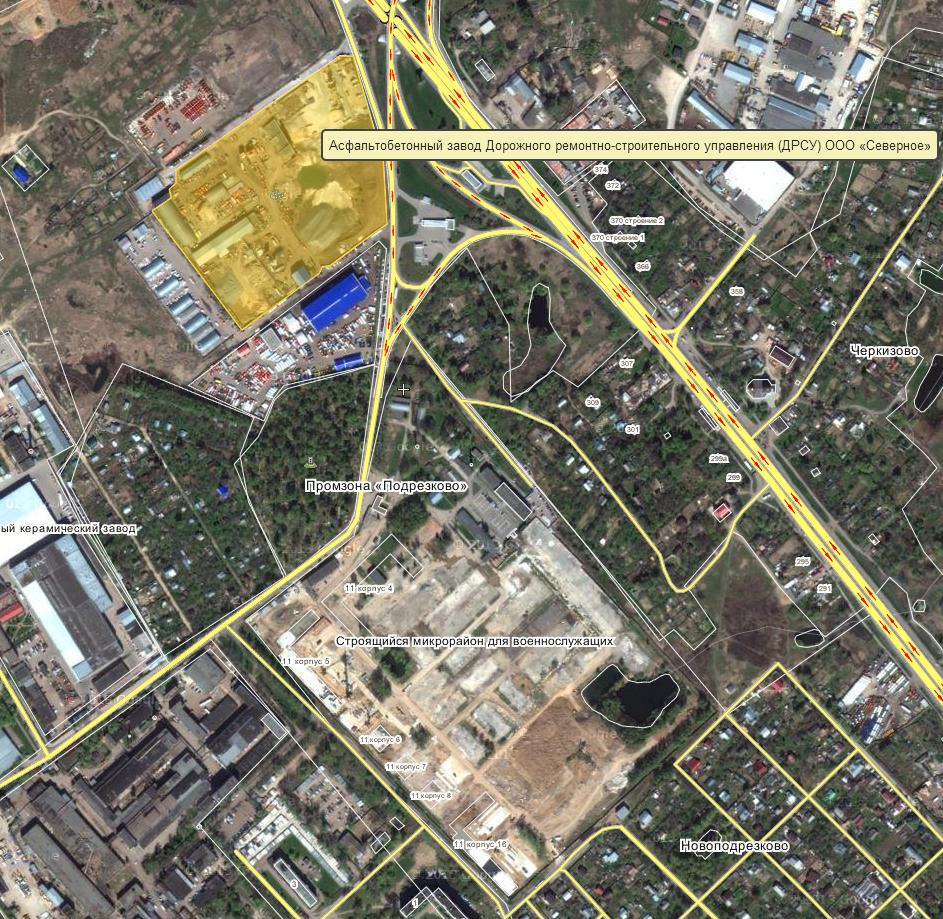 С удивлением для себя обнаружил, что асфальтобетонный завод стоит прям "под окнами" квартир (см. рисунок).