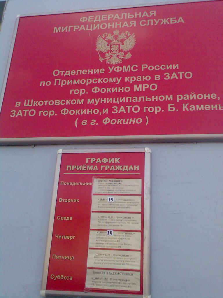 http://www.gosuslugi.ru/ru/stserv/index ... id_4=29825 (ЗАТО г.Фокино) ------ это Отделения УФМС по Приморскому краю. Как Вы и просили. А вот даю Вам телефон инспектора УФМС г.Владивосток Рыбаковой Елены Викторовны, тел.: 8 (4232) 655-574. Все вопросы решал с её помощью, (когда местное отделение отказывалось делать запрос в другой регион о прописке). Желаю удачи!