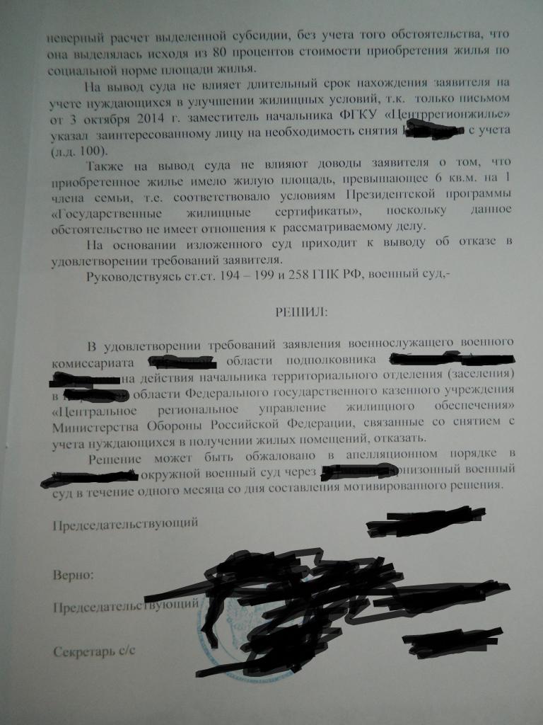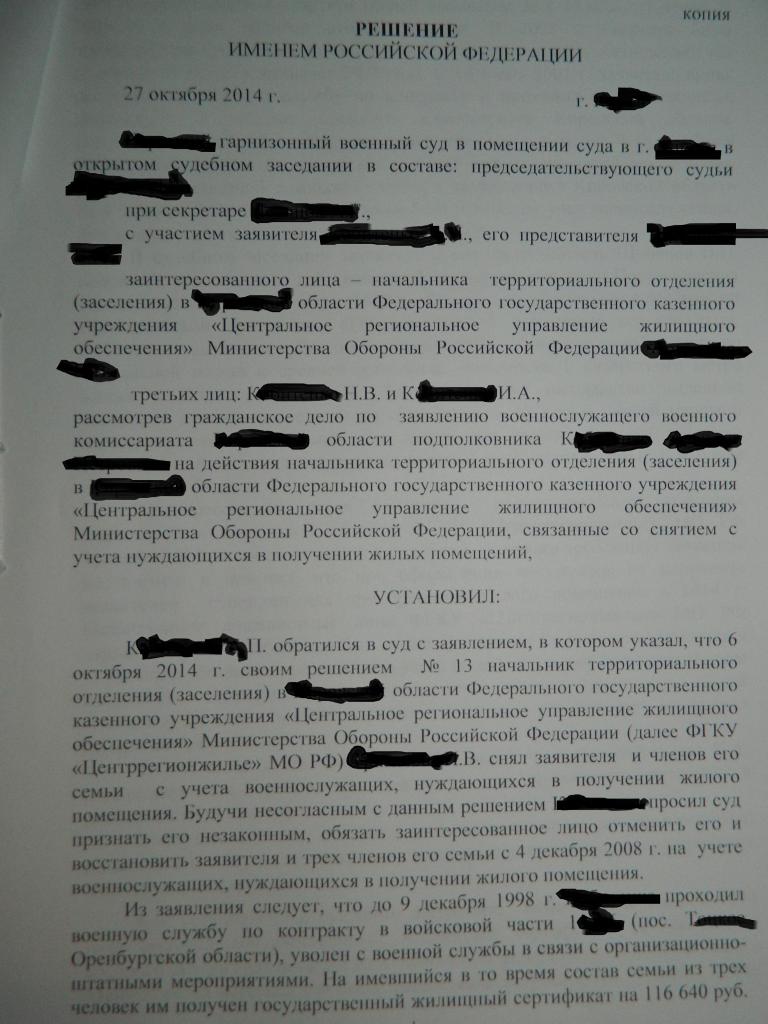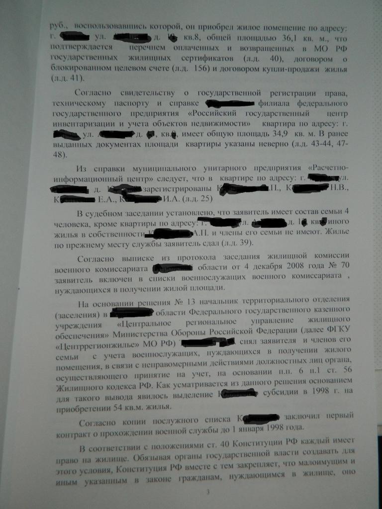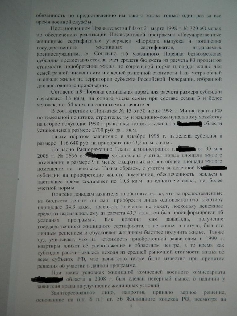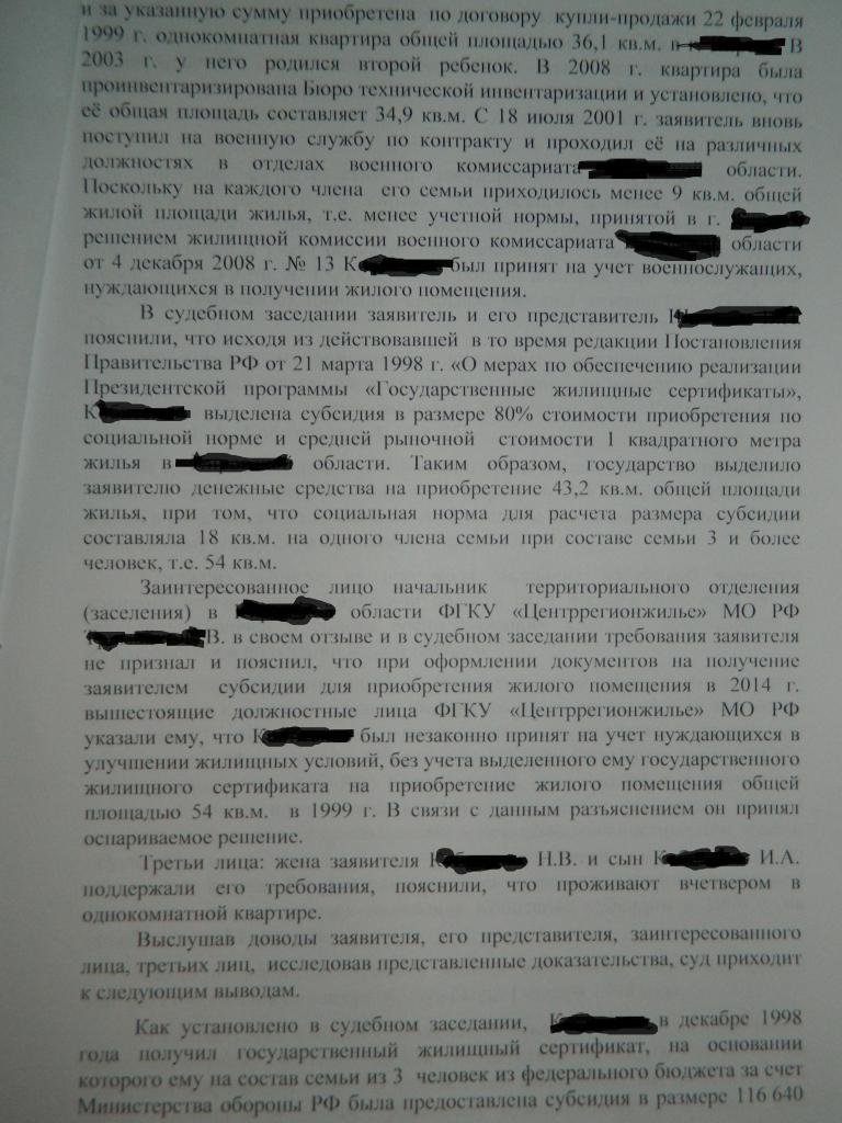 С моей точки зрения судом неверно определены юридически значимые обстоятельства, а именно суд так и не разобрался какое право реализовывал заявитель. В связи с этим, суд применяет норму не подлежащую применению (п.14п ст.15) при этом, неверно её истолковывая (о невозможности реализовать её повторно) о чём и говорит STQwo. Не пременена судом норма позволяющая действующему в/с (проходящему службу и не увольняемому) реализовать своё право на улучшение жилищных условий, так как его жилищная обеспеченность соответствует тем условиям, позволяющим безусловно признать его нуждающимся в жилом помещении. Далее, суд применяет норму права об участии в пронрамме "Жилище" (ГЖС) неверно её истолковывает и, соответственно, применяет. Неверное толкование данной нормы тоже точно и ёмко сформулировано STQwo, ранее. Так как расчёт размера субсидии это одно, а определение жилищной обеспеченности совсем другое. Кроме того, судом не дана оценка и не мотивирован отказ от применения нормы права на которую указывал заявитель о том, что он не обязан был приобретать себе ЖП площадью из расчёта которой производилось определение размера субсидии, а это, считаю, очень важно. Вывод сыда о том, что при признании нуждающимся ДЛ были допущены нарушения, в частности, неверно определена жилищная обеспеченность несостоятелен по этой же причине, что указано выше. Следовательно и принятое судом решение основано на неверном понимании и трактовании нормы права, подлежащей применению к спорным правоотношениям.Выкладываю решение суда